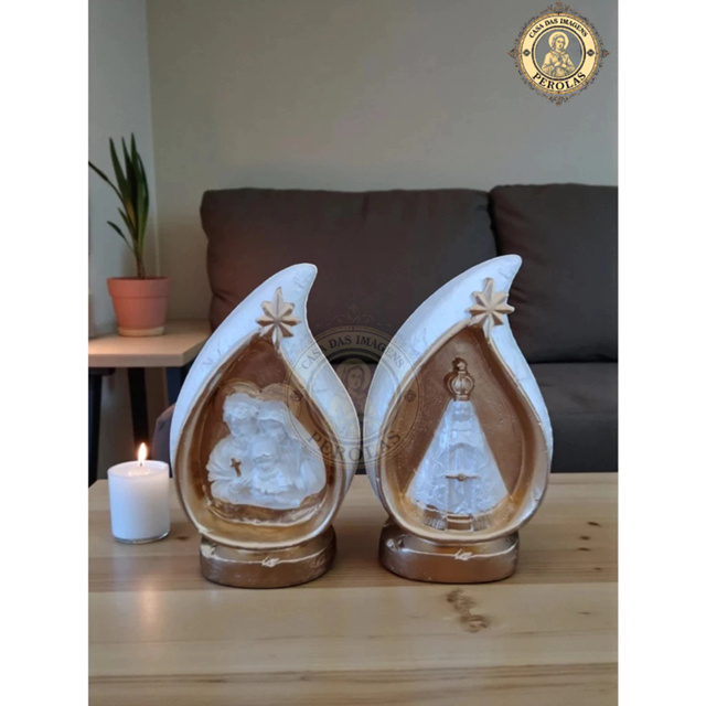 ✨ KIT DECORATIVO RELIGIOSO - 2 PEÇAS ✨ 📿 Nossa Senhora Aparecida na Gota + Sagrada Família na Gota Feitas com todo cuidado e carinho para abençoar e embelezar seu lar! 💛 🕊️ DETALHES DO KIT: 🔹 1x Aparecida na Gota 📏 Tamanho: 14 x 6,5 cm ⚖️ Peso: 290g (aprox.) 🔹 1x Sagrada Família na Gota 📏 Tamanho: 14 x 6 cm ⚖️ Peso: 270g (aprox.) 🎨 Material: Gesso de alta qualidade 🌟 Acabamento: Pintura em pérola com detalhes dourados, trazendo elegância e sofisticação ao ambiente 📌 Ideal para: ✅ Altares ✅ Decoração de ambientes religiosos ✅ Presentes cheios de fé e significado ⚠️ CUIDADOS COM A PEÇA: ❌ Evite quedas e impactos ❌ Não molhar – o gesso é sensível à umidade ✅ Limpar com pano seco e macio para preservar o brilho 🙏 Traga mais fé, proteção e beleza para o seu lar com este lindo kit religioso! 📦 Envio com todo cuidado para que suas peças cheguem intactas até você. 💖 Compre agora e sinta a presença do sagrado no seu dia a dia!