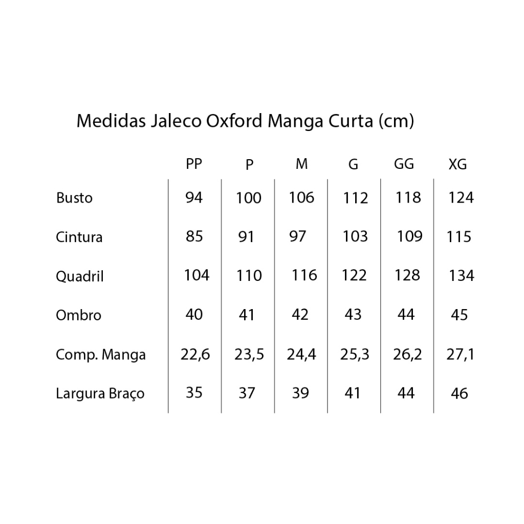 KIT COM 2 JALECOS: 1 JALECO OXFORD ZÍPER MANGA CURTA 1 JALECO OXFORD ZÍPER MANGA LONGA Esse modelo de jaleco é confeccionado em tecido Oxford de alta qualidade e durabilidade, 100% poliéster. Tem modelagem slim, acinturada, com amarração traseira que possibilita melhor ajuste ao corpo. Tem fechamento em zíper frontal simples. O modelo em manga longa tem botão de pressão nos punhos. ESPECIFICAÇÕES TÉCNICAS Tecido: Oxford Composição: 100% poliéster Fechamento: Zíper Corte: Acinturado Tipo de Gola: Gola Padre Bolso: Com 2 Bolsos Garantia do Fabricante: Contra defeitos de fabricação Disponível nos tamanhos PP - 36 / P - 38 / M - 40 / G - 42 / GG - 44 / XG - 46 A modelo tem 1,62m de altura e veste P Todas as nossas medidas podem ser vistas nas imagens CONFIRA SUAS MEDIDAS ANTES DE REALIZAR A COMPRA A grade de medidas tem tolerância de 1,5 cm para mais ou para menos e pode ser vista nas imagens. O tom do tecido pode sofrer uma leve variação dependendo do lote do tecido e da tela em que você esteja vendo nossas fotos. Ambos serão enviados com tecido do mesmo lote (mesmo tom)!