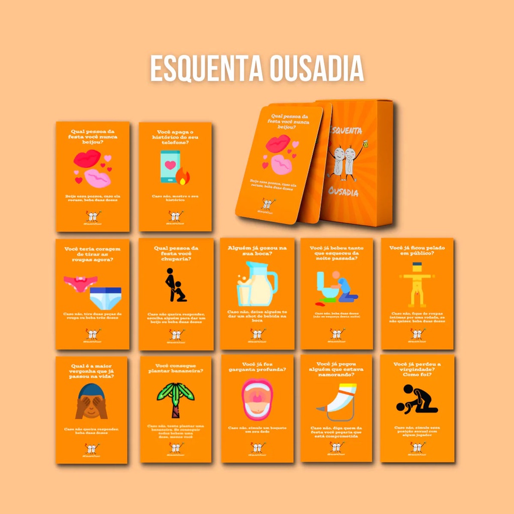 ESQUENTA PESADÃO: Esquenta, Pesadão é o jogo perfeito se você quer sua resenha em outro nível, são 55 cartas pesadíssimas totalmente diferente uma das outras, vários desafios e perguntas que eu duvido você ter coragem de responder! É o baralho perfeito para suas resenhas que estão chatas, depois de adquirir esse baralho nunca mais serão as mesmas, vários desafios diferentes com cartas que não se repetem para deixar todo mundo no chão rapidinho! COMPONTES: 54 Cartas feitas de papel cartão laminado (resistente à água), 1 Manual de instruções. ESQUENTA OUSADIA: Chegou a novidade do momento, o Esquenta, Ousadia, um jogo onde você vai perder a vergonha e vai fazer coisas que nunca fez antes, com uma dinâmica nova de perguntas e desafios para te ajudar a animar aquela resenha chata e fazer todo mundo perder a vergonha! COMPONTES: 55 Cartas feitas de papel cartão laminado (resistente à água), 1 Manual de instruções. FICHA TÉCNICA: Idade: 18+; Jogadores: 2 a 10; Duração: 20 minutos; Categoria: Jogos de Cartas; Mecânicas: Atuação, Eliminação de Jogadores; Temas: Adulto, Humor; Idioma: Português Br. Recomendado para maiores de 18 anos.