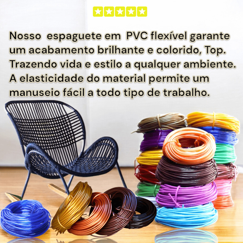 kit com 2 kg ou 2 rolos de fio espaguete: O Fio PVC Cordão espaguete de 6mm da Vitrine & company é a escolha ideal para quem busca versatilidade e qualidade em projetos de artesanato e decoração. Com 1kg ou aproximadamente 55 metros de comprimento, este cordão flexível é perfeito para encapar cadeiras, poltronas e almofadas, além de ser uma excelente opção para a criação de balanços e bolsas. Sua composição em PVC flexível garante um acabamento brilhante e colorido, trazendo vida e estilo a qualquer ambiente. A elasticidade do material permite um manuseio fácil, tornando o processo de aplicação mais prático e eficiente. Recomendado para diversas aplicações, este fio é ideal para reformas e decoração de móveis, além de ser uma excelente opção para projetos artísticos. Com uma espessura de 6mm, ele proporciona resistência e durabilidade, assegurando que suas criações se mantenham impecáveis por muito mais tempo. Aposte na qualidade e na versatilidade do Fio PVC Cordão espaguete da Vitrine & company e transforme suas ideias em realidade. Seja para uso pessoal ou profissional, este produto é a escolha certa para quem valoriza a estética e a funcionalidade em cada detalhe. Características: Rolo com 1 kg contendo aproximadamente 55m (Suficiente para enrolar uma cadeira convencional de varanda) Medidas : Diâmetro externo: 6 mm Espessura da parede 1 mm Garantia do vendedor: 90 dias Perguntas Frequentes: 1) Qual a espessura do fio? R: 6 milímetros de diâmetro e parede de 1 milímetro. 2) Um quilo é suficiente para enrolar uma cadeira adulto? R: Os profissionais utilizam em média um quilo de fio para enrolar uma cadeira. Porém, não tendo muita experiência, sugerimos um quilo e trezentos por cadeira. 3) O fio é feito com material reciclado? R: Não, usamos apenas material virgem na confecção do fio. Com fio PVC, cordão plástico ou espaguete para artesanato, é possível criar, consertar e fazer diversos objetos, como: Cadeiras e bancos: Enrolando o fio em estruturas existentes ou criando novas. Mesas: Decorando tampos ou criando bases. Luminárias: Abajures, lustres e outros tipos de iluminação. Cachepots e vasos de plantas: Revestindo vasos ou criando estruturas. Objetos decorativos: Esculturas, mandalas, cestos, tapetes e outros itens. Revestimento de móveis: Para dar um novo visual a peças antigas. Acessórios: Pulseiras, colares e brincos: Criando bijuterias coloridas e duráveis. Chaveiros e pingentes: Fazendo lembrancinhas e acessórios personalizados. Bolsas e cestas: Produzindo peças utilitárias e estilosas. Cintos: Confeccionando acessórios de moda. Outros Projetos: Brinquedos: Bonecos, animais e outros objetos lúdicos. Redes de proteção: Para janelas, varandas e piscinas. Artesanato em geral: Uma infinidade de projetos dependendo da sua criatividade.