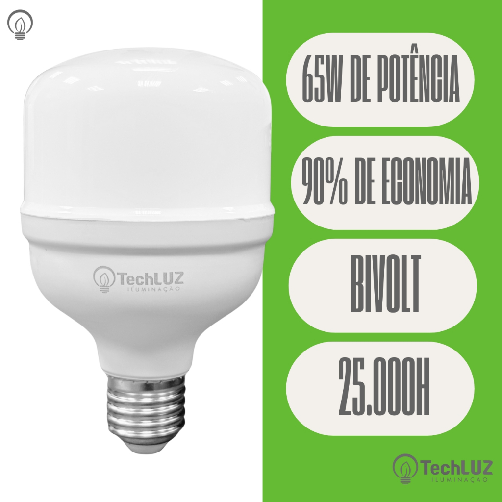 NOVO MODELO! NOVO MODELO! NOVO MODELO! NOVO MODELO! NOVO MODELO! NOVO MODELO! NOVO MODELO! NOVO MODELO! 65w LÂMPADA BULBO LED ALTA POTÊNCIA *IMAGEM ILUSTRATIVA* A lâmpada LED Bulbo TechLuz tem máxima economia de energia , lâmpada de iluminação de alta qualidade. Ela é projetada para substituir as lâmpadas incandescentes convencionais, oferecendo uma opção mais eficiente e econômica. As lâmpadas LED proporcionam economia de 90%. Uma opção sustentável que garante que o valor da sua conta de energia elétrica seja mais baixo! Além disso, essa lâmpada tem uma alta eficiência luminosa, o que significa que produz uma quantidade maior de luz com menos energia. Ela é construída com materiais duráveis e de alta resistência, garantindo uma vida útil longa e confiável. *DIMENSÃO: 12,5 X 7,9 CARACTERÍSTICAS: Potência: 65w Tensão: Bivolt (serve para 110v e 220v) Base: E27 Frequência Nominal: 60Hz Fluxo Luminoso: 5850Lm Eficiência Luminosa: 90lm/W Fator Potência: >0.92 Cor: 6500K (Branco Frio) Vida Útil: até 25.000h IRC: 85 Não Dimerizável 90% de economia *DIMENSÃO: 12,5 X 7,9