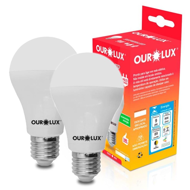 Codigo Interno: K01480 Codigo Fabricante: 20036 Codigo Referencia: 30360602085x2 Kit 2 Lampadas Led Bulbo A60 9W E27 Bivolt 3000K Luz Amarela Ourolux A Ourolux uma empresa especializada em iluminacao com mais de 25 anos de experiencia e referencia no cenario nacional. Com uma variedade de produtos, a Ourolux esta presente em qualquer ambiente, com um design moderno, alem de seus produtos possuirem seguranca e qualidade. CARACTERISTICAS Ideais para ambientes residenciais e comerciais, as SUPERLED BULBO substituem as lampadas incandescentes e fluorescentes, sem perder seu efeito caracteristico, com muito mais economia e durabilidade. Consulte disponibilidade do produto em estoque. ensao eletrica: 100 ~ 240V Frequencia: 50/60Hz Modelo: Bulbo A Garantia do Fabricante: 1 ano para defeitos de fabricacao. Sugestao de uso: Utilizar em ambientes cobertos. ESPECIFICACOES TECNICAS: Modelo: A60 Cod. Manut. de Estoque: 20036 Tensao Eletrica: Multitensao 127V/220V Potencia (W): 9 Fator de Potencia: 0,7 Base de conexao: E27 Fluxo Luz (lm): 803 Lampada Fluorescente Equivalente (W): 16 Lampada Incandescente Equivalente (W): 60 Temp. Cor (K): 3000 (Branca Morna) IRC minimo: 80 Vida (horas): 25000 Dimerizacao: Nao compativel Temperatura Ambiente de operacao (?C): -10?C ~ +40?C Certificacao: INMETRO EAN: 7898324005183 Peso (Kg): 0.038000 Prod. Altura (mm): 116 Prod. Largura (mm): 116 Prod. Comprimento (mm): 60 Tipo de Embalagem: Caixa Emb. Altura (cm): 11 Emb. Largura (cm): 6 Emb. Comprimento (cm): 6 Composicao: Polimero termoplastico, metal e componentes eletronicos. GARANTIA DO FORNECEDOR: 1 Ano.