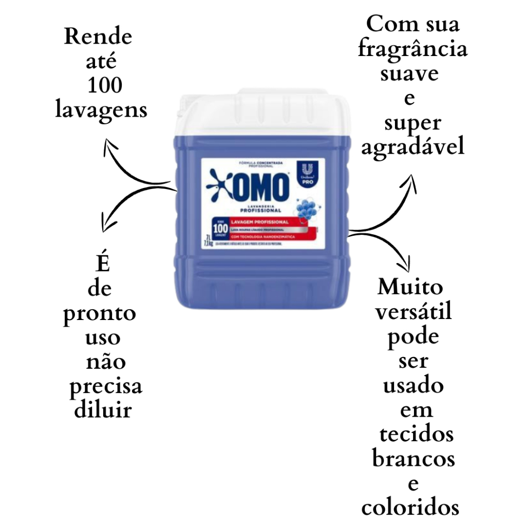 Sabão Líquido OMO Lavanderia Profissional oferece a mais avançada tecnologia de compactação em lava-roupas, que permite o tratamento do mesmo número de peças consumindo menos do seu sabão líquido OMO Lavagem Perfeita PRO galão 7 litros. Poder de limpeza para roupas delicadas e pesadas. Cuida das cores da roupa. Remove as manchas na primeira lavagem. É um produto mais sustentável. COMPOSIÇÃO: tensoativos aniônicos, ajustador de ph, espessantes, coadjuvantes, tamponante, corante, enzimas, branqueador óptico, fragrância, agente anti-redepositante, conservantes e água. PRINCÍPIOS ATIVOS: ácido linear alquilbenzeno sulfônico e alquil éter sulfato de sódio.