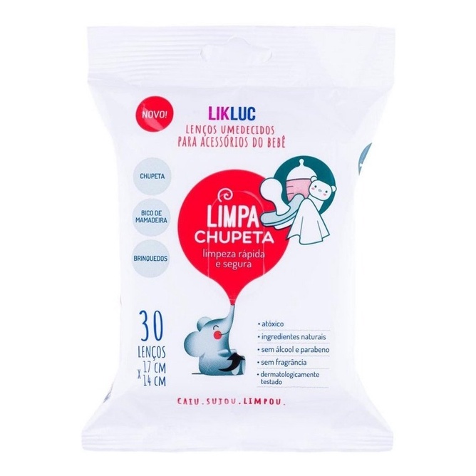 2 PACOTES DE LENÇOS UMEDECIDOS LIMPA CHUPETA ORIGINAL MARACA LIKLUC O produto é original, e não genérico Marca: LikLuc Linha: Limpa Chupeta LIMPA CHUPETAS LENÇOS UMEDECIDOS - LIKLUCOs Lenços Umedecidos Limpa Chupetas sem fragrância feito à base de água e ingredientes seguros são essenciais na bolsa de qualquer mamãe ou papai. Diferente dos lenços comuns, sua fórmula exclusiva usa o poder do bicarbonato de sódio e ingredientes naturais para a correta, rápida e prática limpeza dos acessórios do bebê. Recomendado para limpar com segurança chupetas, mamadeiras , mordedores e brinquedos. Com os Lenços Umedecidos Limpa Chupetas sem fragrância você poderá fazer uma limpeza fácil, rápida e eficiente. Por conter uma fórmula sem qualquer tipo de fragrância, também não possui álcool ou parabenos, sendo um produto simples e extremamente prático. Os Lenços Umedecidos Limpa Chupetas sem fragrância também podem ser usados para limpar além de chupetas, bico de mamadeiras, mordedores e brinquedos. É um item super prático e versátil que todos os papais e mamães precisam ter a mão. É perfeito para usar em viagens ou na rua. Dermatologicamente testado, atóxico e com ingredientes naturais. Especificações dos Lenços Umedecidos Limpa Chupetas sem fragrância: - Embalagem com 30 lenços descartáveis (17 cm x 14 cm);- Medidas: 16,5 cm x 12 cm x 3,5 cm (AxLxP); - Sem álcool e parabenos; - Ingredientes naturais; - Atóxico;- Sem fragrância; APLICAÇÕES:- Higienização de chupetas, mordedores, bicos de mamadeira, copos e até mamilos de lactantes. INSTRUÇÕES DE USO 1. Para abrir levante a aba da etiqueta autoadesiva, puxe a ponta do lenço; 2. Retire o lenço e feche cuidadosamente a embalagem; 3. Usar para limpeza rápida de chupetas, bicos de mamadeira, brinquedos e acessórios de bebê; 4. Descartar o lenço após o uso; 5. Não descartar nos vasos sanitários.