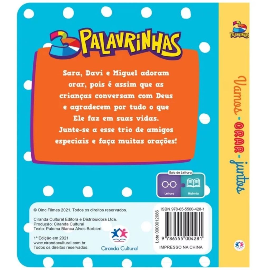 ***** 3 Palavrinhas Vamos Orar juntos ***** Sara, Davi e Miguel amam orar, é assim que as crianças conversam com Deus. Junte-se a esse trio amigos e faça muitas orações! Paginas: 10 ***** Biblia para as meninas ***** Encante-se com as mais belas histórias da Bíblia, como 'Deus cria o mundo e todas as criaturas', 'A arca de Noé e a tempestade', 'O nascimento do Menino Jesus' e muitas outras, que levam você a se aproximar de Deus, o grande Criador do Universo! Além das histórias, há lindos ensinamentos, para você refletir sobre cada um deles. Páginas: 128