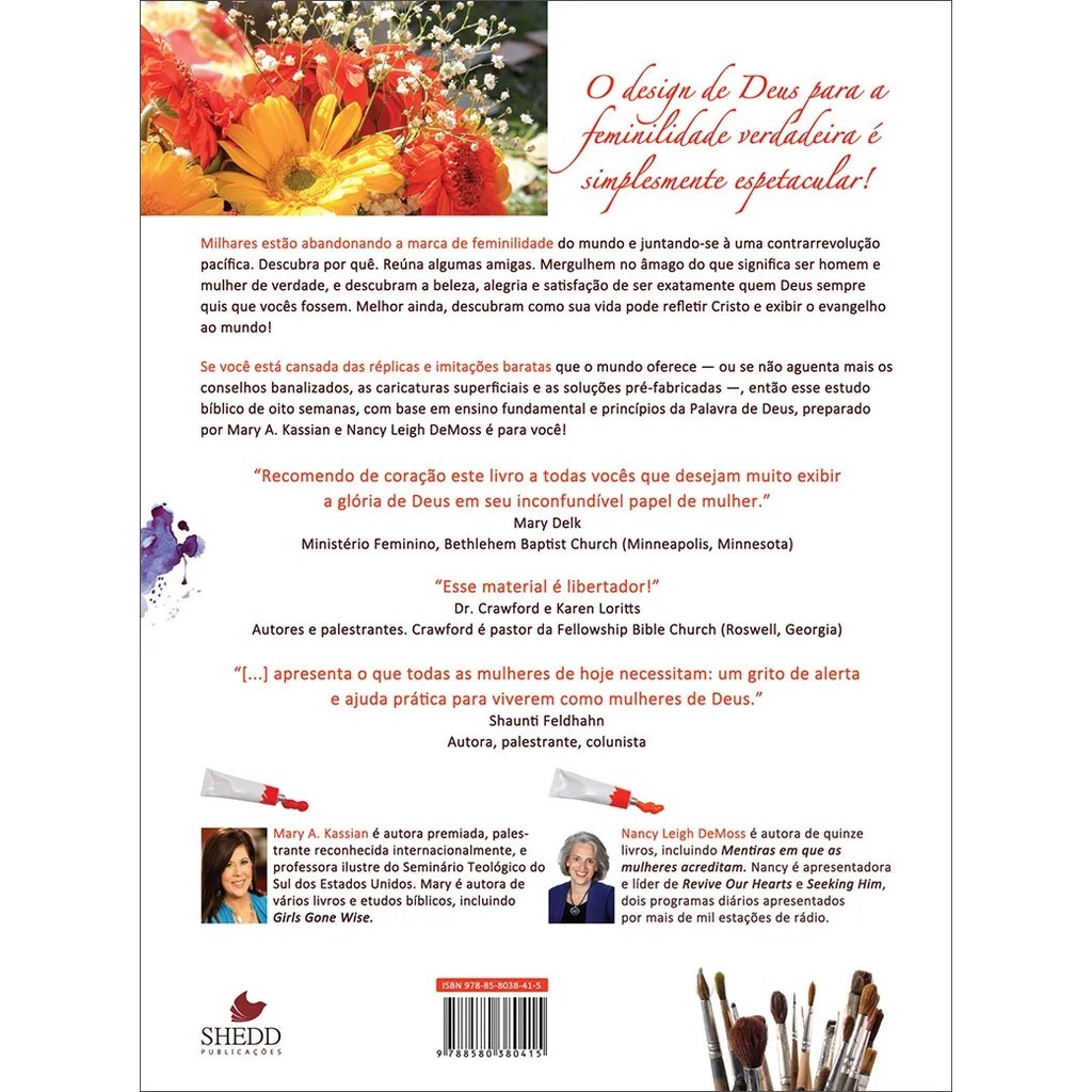 " Kit 2 Livros Mulher e sua verdadeira feminilidade + Dez elementos da feminilidade " Mulher e sua verdadeira feminilidade Vol. 01 : Milhares estão abandonando a marca de feminilidade do mundo e juntando-se à uma contrarrevolução pacífica. Descubra por quê. Reúna algumas amigas. Mergulhem no âmago do que significa ser homem e mulher de verdade, e descubram a beleza, alegria e satisfação de ser exatamente quem Deus sempre quis que vocês fossem. Melhor ainda, descubram como sua vida pode refletir Cristo e exibir o evangelho ao mundo! Se você está cansada das réplicas e imitações baratas que o mundo oferece — ou se não aguenta mais os conselhos banalizados, as caricaturas superficiais e as soluções pré-fabricadas —, então esse estudo bíblico de oito semanas, com base em ensino fundamental e princípios da Palavra de Deus, preparado por Mary A. Kassian e Nancy Leigh DeMoss é para você! Detalhes do produto: Autoras: Nancy Leigh DeMoss e Mary A. Kassian Editora: Shedd Publicações Acabamento: Brochura Formato: 21 larg. X 28 alt. Páginas: 224 Dez elementos da feminilidade Vol. 02 : Milhares estão abandonando a marca de feminilidade do mundo e juntando-se à uma contrarrevolução pacífica. Descubra por quê. Reúna algumas amigas. Mergulhem no âmago do que significa ser homem e mulher de verdade, e descubram a beleza, alegria e satisfação de ser exatamente quem Deus sempre quis que vocês fossem. Melhor ainda, descubram como sua vida pode refletir Cristo e exibir o evangelho ao mundo! Mulher: dez elementos da feminilidade, design interior celebra as mulheres e os belos elementos do design que as tornam femininas baseado em Tito 2, que, em geral, é considerado o mapa para o ministério mulher a mulher. As autoras fornecem um estudo biblicamente são e profundo com um design moderno que atrai as mulheres a essa mensagem. O livro preenche um vazio relevante no discipulado das mulheres, sendo um recurso valioso para a igreja, os pequenos grupos e estudos individuais. Detalhes do produto: Autoras: Nancy Leigh DeMoss e Mary A. Kassian Editora: Shedd Publicações Acabamento: Brochura Formato: 21 larg. X 28 alt. Número de Páginas: 272