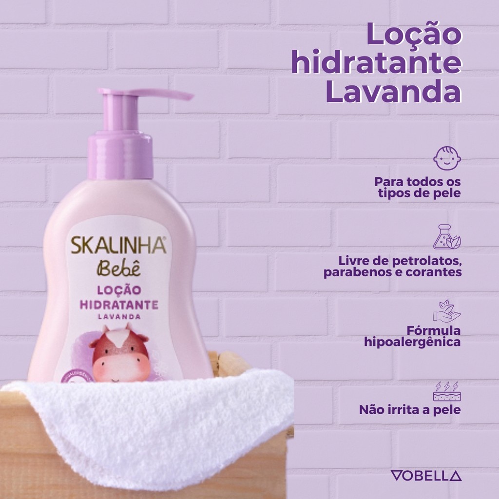 Oii, é um prazer ter você aqui! Procurando a loção perfeita para cuidar da pele delicada do seu bebê? O Kit Loção Hidratante Bebê Infantil Lavanda Skalinha é a escolha ideal! O que é: - Kit 2 Loções Hidratantes Skalinha. - Fragrância: Lavanda. - Marca: Skala. - Hipoalergênico. - Livre de Parabenos. - Vegano. - Não testado em animais. - Testado dermatologicamente. O que tem: - pH Balanceado. - Lavanda. O que faz: - Hidrata de maneira suave. - Protege de deagressões externas. Indicado para: - Crianças de todas as idades. Como usar: - Aplique com movimentos suaves massageando a pele da criança. - Pode ser usada diariamente. Perfeito para o uso diário, ajuda a manter a pele macia e protegida. Garanta já o cuidado que o seu pequeno merece! Surgiu alguma dúvida? Entre em contato com a gente! Boas Compras :)