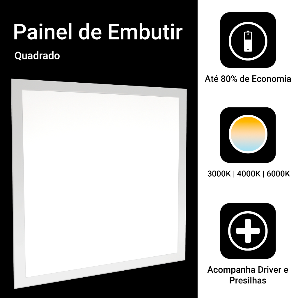 * No momento temos em estoque esse modelo em 36w e 40w. Apesar da diferença, garantimos que os dois modelos são de mesma qualidade e mesma quantidade de lúmens, ou seja, um painel de 36w ilumina o mesmo que um de 40w. Se na sua compra forem adquiridas mais de 1 unidade, faremos o envio do produto na mesma marca e potência. Agradecemos a compreensão! * O Painel de LED Embutir permite uma iluminação bem distribuída tornando o ambiente elegante, agradável e moderno. Podem ser instalados em superfícies variadas, como por exemplo: forros de gesso, modulares, forros de madeira, PVC ou similares, proporcionando uma iluminação abrangente e difusa. Esta luminária precisa ser embutida no local desejado, isto é, ela demanda um recorte na área na qual será instalada. Nossos painéis possuem um acabamento minucioso, fabricados com Led de alta qualidade em uma capa de alumínio e acrílico, proporcionam uma iluminação eficiente e com excelente reprodução de cor no facho de luz. Características: - Iluminação de altíssima qualidade deixando o ambiente elegante, agradável e moderno; - Excelente distribuição de luz; - Alta economia de energia; - Acabamento minucioso; - Qualidade na reprodução de cor da luz; - Longa vida útil; - Não emite raio ultravioleta, nem infravermelho. Informações técnicas - Potência: 36W ou 40W - Modelo: Quadrado embutir - Material: Alumínio e acrílico - Temperatura de cor: Branco Frio, Branco Neutro e Branco Quente - Luminosidade: Aproximadamente 3600lm - Vida útil estimada (L70) em 25.000h - Voltagem: AC110-220V (Bivolt) - Frequência: 50/60 Hz - Ângulo de abertura: 120° - Temperatura de operação: -20ºC a 50ºC - Economia de energia em até 80% - Proteção: IP20 - Dimensões: 40x40x0,7cm - Corte: 38,5x38,5cm **SUGERIMOS QUE REALIZE O CORTE SOMENTE QUANDO RECEBER E TESTAR O PRODUTO** Itens Inclusos Embalagem, presilha (mola) para fixação e driver para ligação na rede elétrica. * Todos os nossos itens são conferidos e testados antes do envio. ** Trabalhamos apenas com materiais que conhecemos e confiamos para proporcionar o melhor custo benefício para você. *** Verifique se todas as informações estão corretas antes de finalizar a seu pedido **** 3 Meses de garantia. Desejamos a você uma ótima compra!