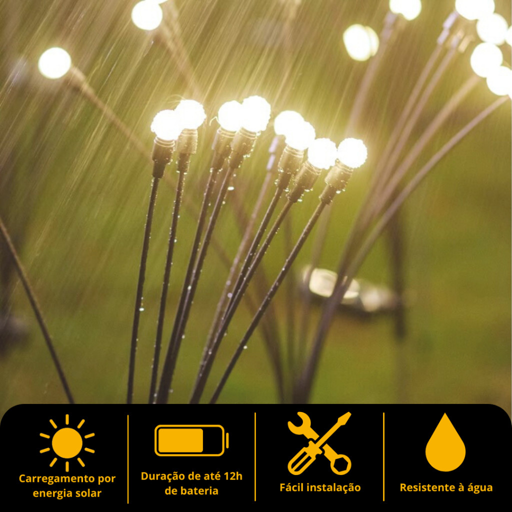 Adicione um toque encantador à sua área externa, transformando seu jardim ou pátio com uma atmosfera mágica. Essas luzes elegantes iluminam o ambiente com um brilho acolhedor, enquanto reproduzem o movimento suave dos vaga-lumes ao vento. Cada luz conta com 8 LEDs brilhantes que oferecem uma iluminação delicada e envolvente, criando um cenário fascinante. Alimentadas por energia solar, essas luzes recarregam durante o dia e acendem automaticamente ao anoitecer, garantindo economia de energia. Instruções de uso Ligue o interruptor do painel solar. Para testar a luz, cubra o painel solar após carregá-lo. Características LUZES SOLARES BALANÇANTES COMO VAGA-LUMES: Estas luzes solares externas possuem fios flexíveis que permitem o movimento suave com o vento, simulando o efeito dos vaga-lumes no escuro. Cada luz tem 8 LEDs grandes e brilhantes, diferentemente de outras opções do mercado que possuem apenas 6 LEDs. Duas unidades de luzes solares de vaga-lume com 8 LEDs: Cada luz possui 8 LEDs de cor quente, criando uma atmosfera mágica e a sensação de vaga-lumes flutuando pelo jardim à noite. Resistência à água e longa duração: As luzes solares Firefly têm classificação IP65, suportando chuva, neve, geada e granizo. Mesmo em dias nublados, iluminam por até 12 horas após 6 a 8 horas de carga solar. Controle automático de luz inteligente: Posicione-as em um local ensolarado para que recarreguem automaticamente, acendendo ao anoitecer e desligando ao amanhecer. Elas são totalmente movidas a energia solar, o que elimina gastos adicionais. Instalação simples e durabilidade: Muito fáceis de instalar, basta fixá-las no solo. Feitas de plástico ABS resistente à corrosão, elas são duráveis e decoram o jardim com charme. Decoração ideal para o jardim ao ar livre e presente especial: Com uma luz suave e ambiente festivo, são ideais para decorar pátios, caminhos e gramados, além de serem uma ótima escolha para ocasiões como Natal, casamentos, Ano Novo, entre outros. Podem ser um presente ideal para datas comemorativas. Cenários de uso Essas luzes solares podem ser usadas em jardins, gramados, canteiros de flores, pátios e passarelas, ou para embelezar eventos especiais. Especificações Cor: Branco quente Quantidade: 2 unidades LEDs por luz: 8 Material: ABS, PVC e aço inoxidável Potência: Painel solar de 0,3 W Tensão: 2 V Tempo de carga: 6 a 8 horas Tempo de operação: 8 a 12 horas Resistência à água: IP65 Cuidados Carregue sob luz solar por 4 a 6 horas antes de usar. Para testes diurnos, cubra o painel solar e pressione o interruptor. A duração da iluminação depende do tempo de carga.