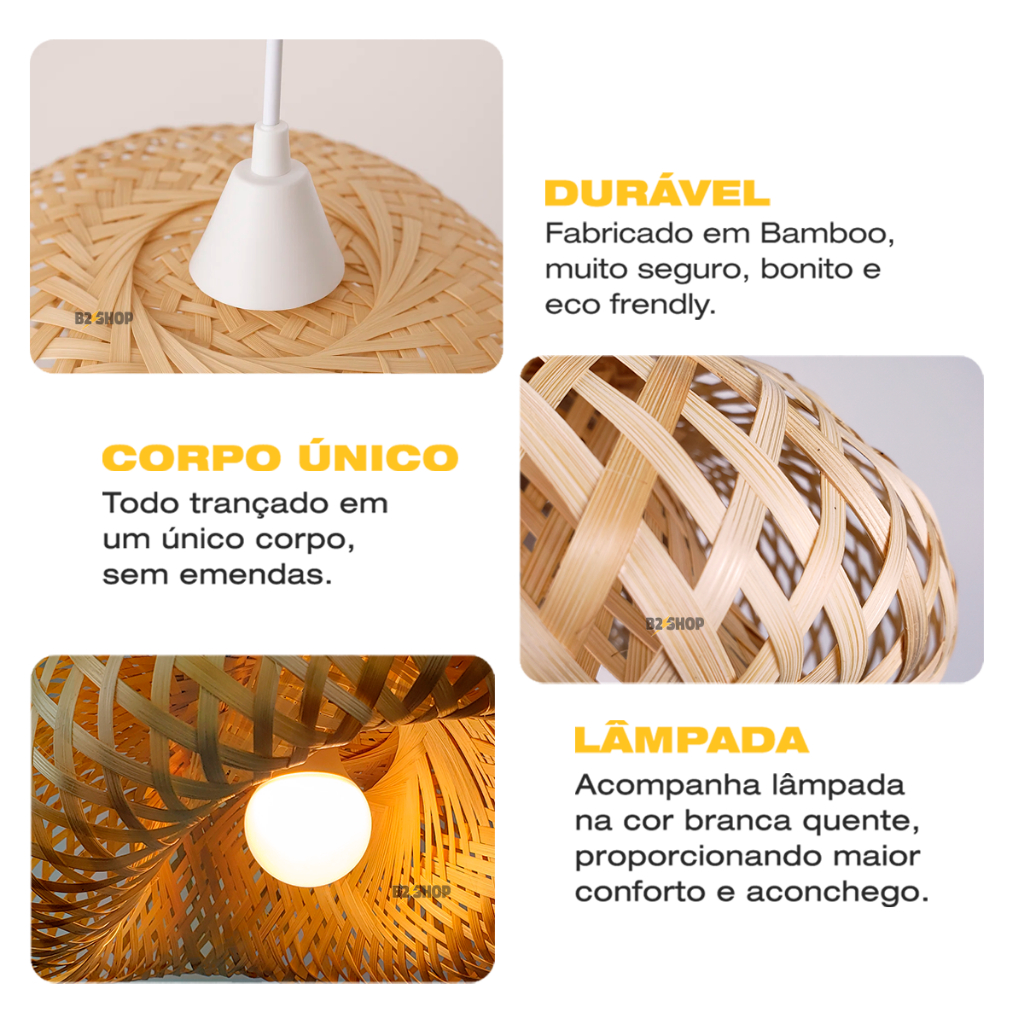 KIT 2 LUSTRES PENDENTES RÚSTICOS 40CM - BAMBU - ALTURA AJUSTÁVEL ACOMPANHA LÂMPADA BRANCA QUENTE - ALTURA ATÉ 200CM - BIVOLT <> 02 UNIDADES <> [ ENVIO RÁPIDO <> NFe + GARANTIA <> PRONTA ENTREGA ] Com ótimo custo benefício, esse Lustre Pendente em Bambu traz requinte e sofisticação ao seu ambiente, seja uma sala de estar, jantar, restaurante, loja, entre outros. Construído em forma artesanal de bambu, deixado o ambiente mais rústico e bem decorado. Combinação que proporciona um ambiente aconchegante. INSTALAÇÃO: O lustre deve ser instalado por um profissional especializado. Sua construção é feita para ser instalado sobreposto. AJUSTE DE ALTURA: Na base do lustre você consegue ajustar a altura para melhor se adequar ao seu ambiente. O ajuste deve ser feito antes da instalação. ACOMPANHA LÂMPADA: Os produtos acompanham 2 lâmpadas de LED de 9w. CARACTERÍSTICAS TÉCNICAS: Tensão de operação: 110~240v Material do corpo: Bambu Fonte de Luz: Lâmpadas de LED Potência: 9W Vida útil: 50.000 horas Cor da luz: Branca quente. Diâmetro: 40cm Altura total: 220cm (ajustável) Instalação: Sobrepor (pode ser embutido com adaptação) Peso total: 1kg ITENS INCLUSOS 02 Lustres em Bambu Completo 02 Suportes para fixação com parafusos 02 Lâmpadas