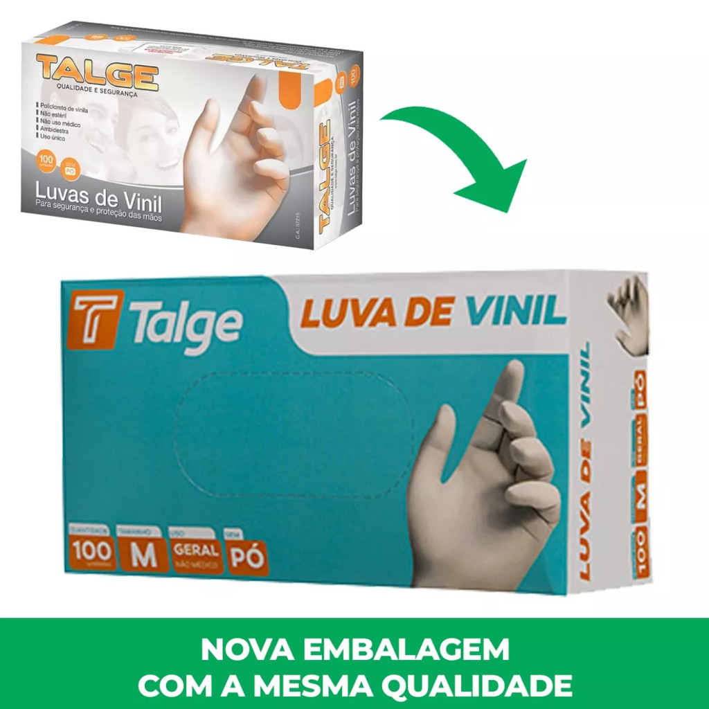 Luva de Vinil Sem Pó Descartável Talge - CA 47095Proteção, conforto e segurança para diversas atividades! As luvas descartáveis de vinil Talge são ideais para quem busca praticidade e segurança em uma variedade de tarefas. Perfeitas para uso em ambientes de saúde, indústria, manipulação de alimentos, limpeza e muito mais, elas oferecem proteção eficaz contra contaminantes e reduzem o risco de exposição a agentes nocivos. Com um design que permite facilidade de uso, as luvas de vinil proporcionam a confiança necessária para realizar suas atividades com total segurança. Características e Benefícios: Segurança em Diversos Ambientes: Indicadas para uso em clínicas, laboratórios, manipulação de alimentos, limpeza e demais áreas que exigem proteção para as mãos. Sem Látex e Sem Aceleradores Químicos: Ideal para quem tem alergia a látex ou hipersensibilidade à produtos químicos. Proteção e Conforto: Fabricadas para oferecer boa resistência a contaminantes e ambientes com risco biológico, essas luvas proporcionam uma proteção eficiente sem abrir mão do conforto. Uso Único e Prático: São descartáveis, garantindo maior praticidade e higiene. Perfeitas para tarefas de curto prazo. Hipoalergênicas: O material de vinil não causa reações alérgicas, sendo perfeito para pessoas com pele sensível. Especificações Técnicas: Marca: Talge Modelo: Luva de Vinil Descartável Cor: Incolor/Transparente Sem pó: Garantindo mais conforto e evitando resíduos na pele Hipoalergênica: Ideal para quem tem alergias ou sensibilidade cutânea Ambidestra: Pode ser usada em qualquer uma das mãos Uso Único: Descartável após o uso Certificação: CA 47095 Conteúdo: Cartucho com 100 unidades Indicações de Uso: Indústria: Proteção nas linhas de produção e manuseio de produtos Saúde: Usada em clínicas, hospitais e consultórios para proteger profissionais e pacientes Alimentos: Para manipulação segura e higienizada de alimentos Limpeza e Higiene: Perfeita para serviços de limpeza em geral, garantindo proteção contra substâncias agressivas Dúvidas Frequentes: Nota Fiscal: Todos os nossos produtos acompanham Nota Fiscal, tanto para pessoas físicas quanto jurídicas. A nota será emitida com os dados cadastrados no marketplace, e não será possível alterar após a compra. Envio: Produtos disponíveis para envio imediato. Compra realizada até o horário limite será enviada no mesmo dia! Palavras-chave: Luva vinil, luva descartável de vinil, luva de vinil transparente, luva de vinil hipoalergênica, luva vinil sem pó, luva para saúde, luva para alimentos, luva para limpeza, luva de vinil Talge, luva para clínicas, luva para indústria, luva ambidestra, luva vinil tamanho P, M e G, luva proteção, luva flexível, luva descartável.
