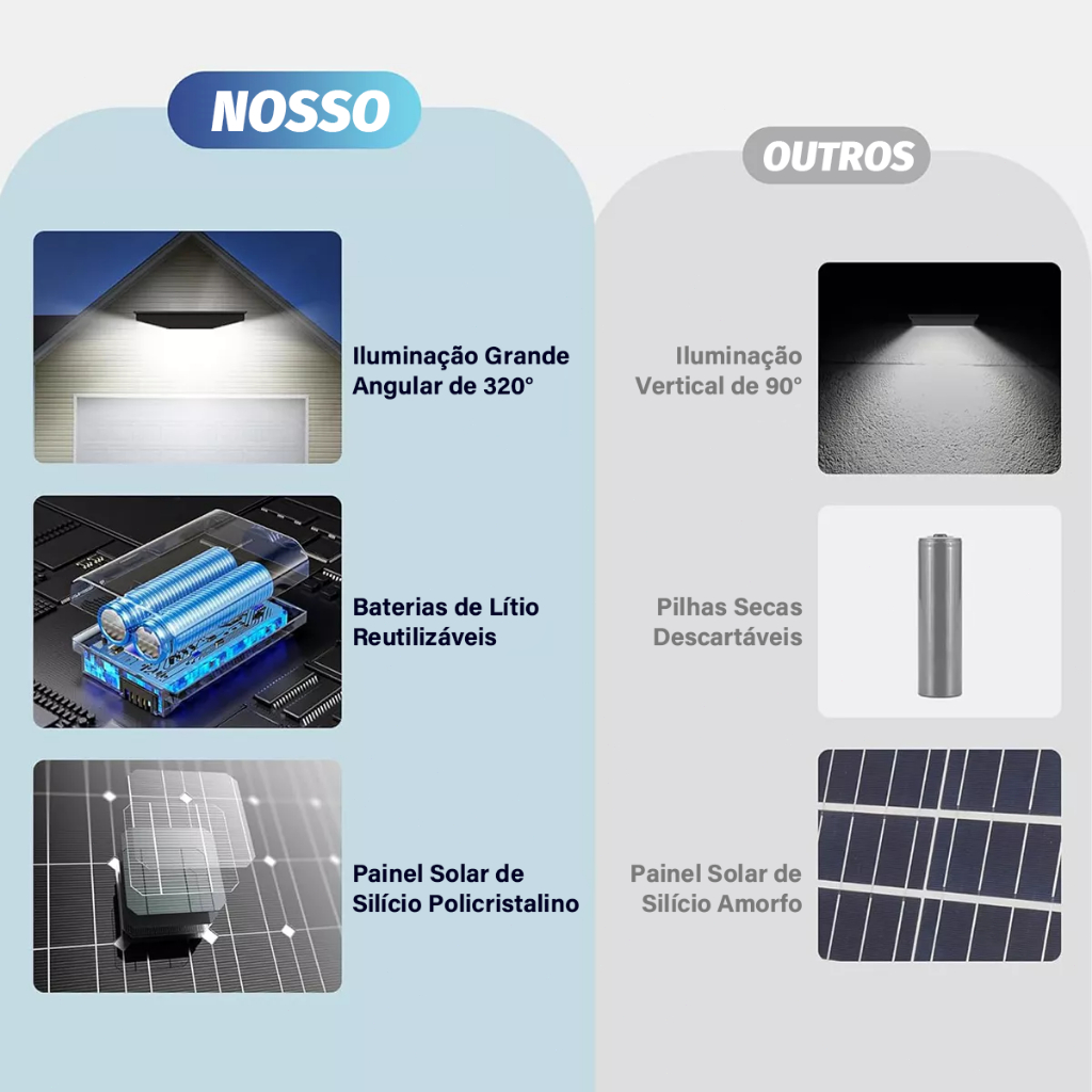 A IRONHOOF oferece uma linha inovadora de produtos para iluminação solar, incluindo luminárias solares de alta performance. Ilumine seus espaços externos com a tecnologia solar líder da IRONHOOF! Oferecemos qualidade premium, durabilidade e economia de energia, ideal para residências, comércios e áreas públicas. CARACTERÍSTICAS PRINCIPAIS: Brilho Intenso: 12.000 lúmens com LEDs 5730 de alta eficiência (luz branca fria 6000K) Autonomia Prolongada: Funciona por 12-18 horas após carga completa (6-8 horas de sol) Bateria Durável: 5000mAh com vida útil superior a 50.000 horas Resistência: IP66 à prova d'água, suporta temperaturas de -40°C a 60°C SENSOR INTELIGENTE: Acende automaticamente no escuro e apaga ao amanhecer Detecção de movimento (7 metros): 100% de brilho com movimento, 30% em modo economia Controle remoto com 8 modos (timer, luz fixa, ajuste de brilho) ESPECIFICAÇÕES TÉCNICAS: Painel Solar: Policristalino 6V/5W (25% de eficiência de conversão) Material: ABS resistente a impactos Dimensões: 42 x 15 x 5 cm (cada lâmpada) CONTEÚDO DA EMBALAGEM: 2 x Lâmpadas Solares 2 x Suportes de Montagem 2 x Conjuntos de Parafusos 2 x Controles Remotos INSTALAÇÃO E USO: 1.Primeira Carga: Ligue o interruptor na posição ON (luz vermelha indica carregamento) Posicione o painel solar sob luz solar direta por 6-8 horas 2.Controle Remoto: Modos disponíveis: Sensor de movimento, timer (2h/4h/6h), luz fixa e desligamento automático 3.Dicas de Manutenção: Limpe o painel solar regularmente para máxima eficiência Evite sombras ou obstruções no painel durante o dia 4.GARANTIA E SUPORTE: Garantia do Vendedor: 12 meses contra defeitos de fabricação Atendimento 24h: Suporte técnico via e-mail ou chat VANTAGENS DO NOSSO PRODUTO: 1.Brilho Superior 200 LEDs 5730 (12.000 lúmens), 30% mais intenso que modelos convencionais Iluminação 320° para ampla cobertura (jardins, garagens, áreas comerciais) 2.Autonomia Estendida Bateria 5000mAh recarregável em 6h de sol, dura até 18h (modo economia) Vida útil da bateria: 5 anos (50.000 horas), 2x mais que a média do mercado 3.Resistência a Climas Extremos IP66 à prova d'água: suporta chuvas tropicais, ventos fortes e temperaturas de -40°C a 60°C Sensor Inteligente com Economia de Energia Detecção de movimento de 7m: 100% de brilho ao detectar pessoas, 30% em repouso Automático: liga ao anoitecer e desliga ao amanhecer (sem intervenção manual) 4.Controle Remoto Multifuncional 8 modos ajustáveis: timer (2h/4h/6h), luz fixa, sensor de movimento e desligamento total 5.Instalação Instantânea Sem fios ou eletricista: montagem em minutos com suporte incluso Painel solar integrado: posicionamento flexível para captação solar eficiente 6.Custo Zero de Energia Redução de 100% na conta de luz para iluminação externa 7.Kit Duplo com Valor Agregado 2 lâmpadas + 2 controles remotos: ideal para iluminar áreas grandes com economia PERGUNTAS FREQUENTES: 1.Por que minha lâmpada solar não acende? Verifique: Interruptor na posição ON, carga suficiente (6-8h de sol), painel solar sem obstruções 2.Quanto tempo dura a bateria após uma carga completa? Modo sensor: Até 18 horas (30% de brilho em repouso) Modo luz fixa: 6-8 horas (100% de brilho) 3.A lâmpada funciona em dias nublados? Sim, mas a carga será mais lenta (autonomia pode reduzir 30-50%) 4.Como proteger a lâmpada em tempestades? É resistente a água IP66, mas recomendamos desligar em tempestades muito intensas 5.O sensor de movimento não detecta pessoas? Ajuste a altura para 2-3m, limpe o sensor, evite fontes de calor/luz próximas 6.Posso usar em locais com sombra? Não recomendado - precisa de sol direto para carregar eficientemente 7.Como limpar a lâmpada? Use pano úmido sem produtos químicos ou água com sabão neutro 8.A bateria pode ser substituída? Sim, a bateria de lítio é removível e pode ser trocada após 5 anos 9.Por que a luz fica mais fraca? Possíveis causas: bateria descarregada, painel sujo ou LEDs envelhecidos 10.Tem garantia? Sim, 12 meses contra defeitos de fabricação 11.Instalação profissional necessária? Não, o kit inclui suporte e parafusos para instalação fácil 12.Controle remoto não funciona? Verifique: pilhas, distância (até 8m) e interferências de outras fontes IR