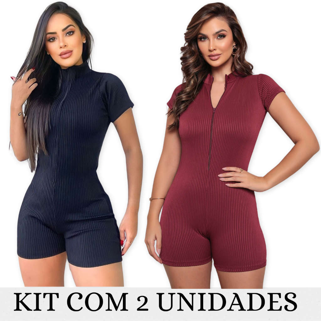 Kit 2 Macaquinhos Feminino Canelado 3D Virginia Ziper Shorts Macacão Curto Moda Gringa Blogueira