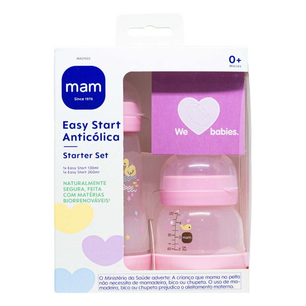 Kit 2 Mamadeiras Easy Start Set 130/260ml - MAM O Kit Starter Set da MAM foi desenvolvido com bico Skinsoft, de silicone simétrico e ultra macio. Possui uma válvula na base da mamadeira que impede a formação de bolhas de ar e a formação de espuma no líquido. Isso cria um fluxo suave e impede que a criança engula ar. Ela é totalmente desmontável e auto esterilizável em 3 minutos, uma tecnologia exclusiva MAM: pode ser utilizada mesma fora de casa. Compatível com diferentes tamanhos de bicos MAM. O MINISTÉRIO DA SAÚDE ADVERTE: A CRIANÇA QUE MAMA NO PEITO NÃO NECESSITA DE MAMADEIRA, BICO OU CHUPETA. O USO DE MAMADEIRA, BICO OU CHUPETA PREJUDICA O ALEITAMENTO MATERNO. Principais Características: - Tamanho do Bico: 0m+ e 2m+ - 1 Mamadeira 130ml - Bico fluxo super lento 0m+ - 1 Mamadeira 260ml - Bico fluxo médio 2m+ - Bico com tecnologia SkinSoft, macio e com superfície texturizada - Design Funcional, confortável de segurar - Desmontável Bocal largo, facilitando a limpeza e o enchimento - Com tampa grudada, que protege o bico - Auto esterilizável - Compatível com outros bicos MAM - Livre de BPA e BPS - Fácil de limpar e utilizar Especificações Técnicas: - Conteúdo da Embalagem: 1 Mamadeira Start Set 130ml + 1 Mamadeira 260ml + Manual. - Material: Polipropileno e Bico de Silicone. - Garantia: 30 Dias (Contra Defeito de Fabricação Pelo Fabricante) - Certificação Inmetro: CE-PUR/IQB 000153 NBR 13793 – OCP 006 - Referência do Fabricante: MA21021 / MA21022 / MA21023 - Código EAN: 9001616718014 / 9001616718021 / 9001616718038 - Marca: MAM Imagens meramente ilustrativas, as cores e estampas podem variar de acordo com o lote do fabricante.