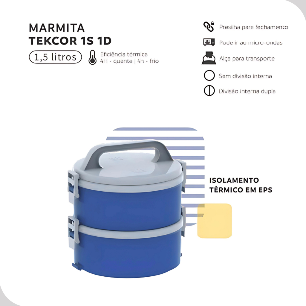 Kit 2 Marmitas Térmicas 1,5L Sem Divisória Azul Microondas Soprano O Kit com 2 Marmitas Térmicas Soprano é ideal para transportar refeições de forma prática e segura. Com capacidade de 1,5L cada, são perfeitas para uso no trabalho, na construção civil, no campo ou no dia a dia. Produzidas em material resistente, possuem alça robusta para transporte, presilhas firmes de fechamento e podem ser utilizadas no micro-ondas (sem a tampa). Especificações: Capacidade: 1,5L cada marmita Cor: Azul Material: Polipropileno de alta resistência Dimensões: 22,1 cm (C) x 20,3 cm (L) x 14,5 cm (A) Eficiência térmica: mantém quente por até 4 horas e frio por até 4 horas Marca: Soprano Benefícios: Kit com 2 marmitas para maior praticidade Conserva alimentos quentes ou frios por até 4 horas Alça robusta para transporte seguro Pode ser usada no micro-ondas sem a tampa ou em banho-maria Ideal para uso diário em diferentes ambientes Conteúdo da Embalagem: 2 marmitas térmicas de 1,5L sem divisória com tampa Soprano Instruções de Uso e Cuidados: Lavar antes do primeiro uso. Não levar ao forno ou ao fogo. Não lavar por imersão. Evitar objetos abrasivos como esponjas de aço. Para remover odores, utilize solução de água com bicarbonato de sódio. Sempre usar conforme as instruções do fabricante.