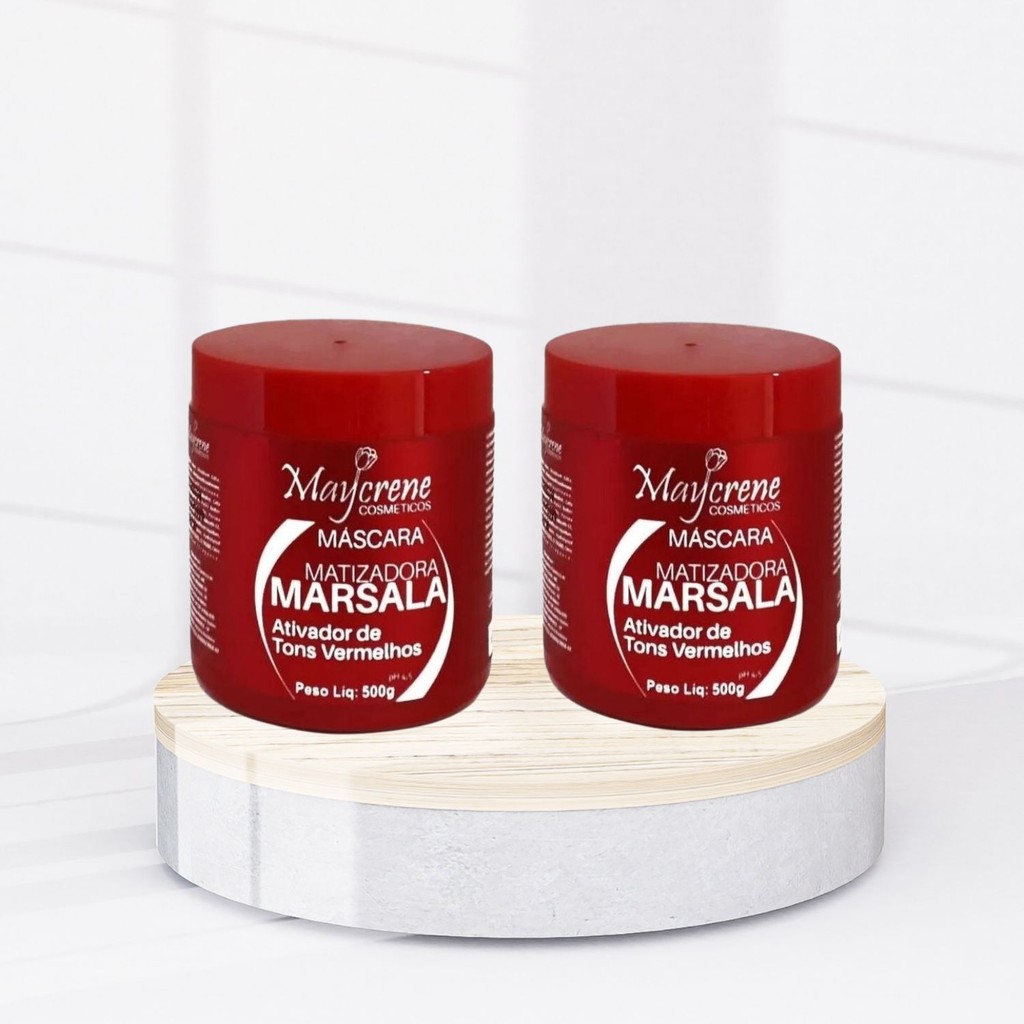 Temos a pronta entrega, enviamos em até 24hrs uteis Máscara Matizador Marsala A Máscara Matizadora Marsala foi especialmente desenvolvida para cabelos ruivos e vermelhos. Com sua fórmula contendo ativos hidratantes (como o D-Phantenol e o Whey Protein) promove total matização dos cabelos sem ressecar. Modo de Usar: 1- Após o enxague do shampoo pegue a quantidade desejada da Máscara Matizadora Marsala com uma espátula e com as mãos espalhe o produto do meio até as pontas dos fios (não passe na raiz). Aguarde 15 minutos e enxágue tirando todo o produto. Conteúdo da Embalagem: 2 Máscara Matizadora Marsala Vermelho 500g - Maycrene