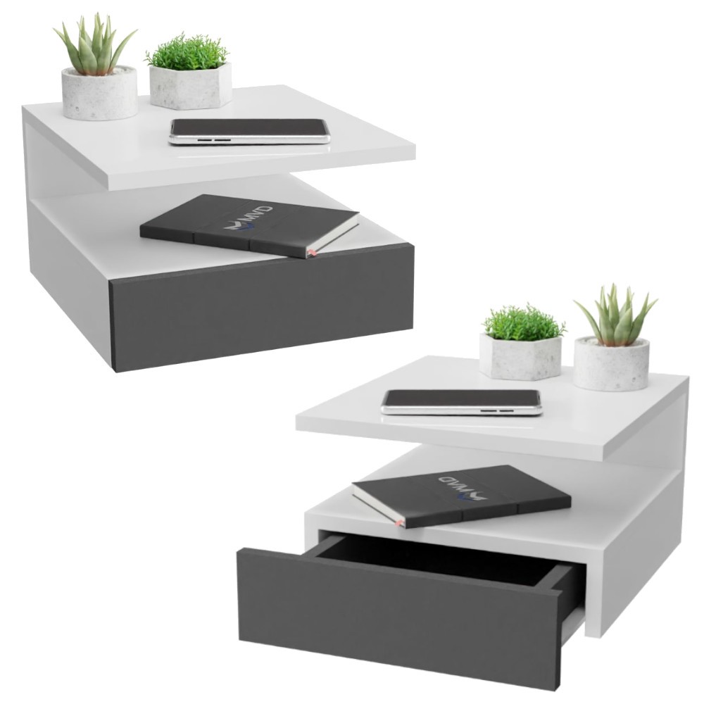Kit 2 Mesa De Cabeceira Com Gaveta e Prateleira Mesinha Suspensa Branco e Preto MVD Moveis