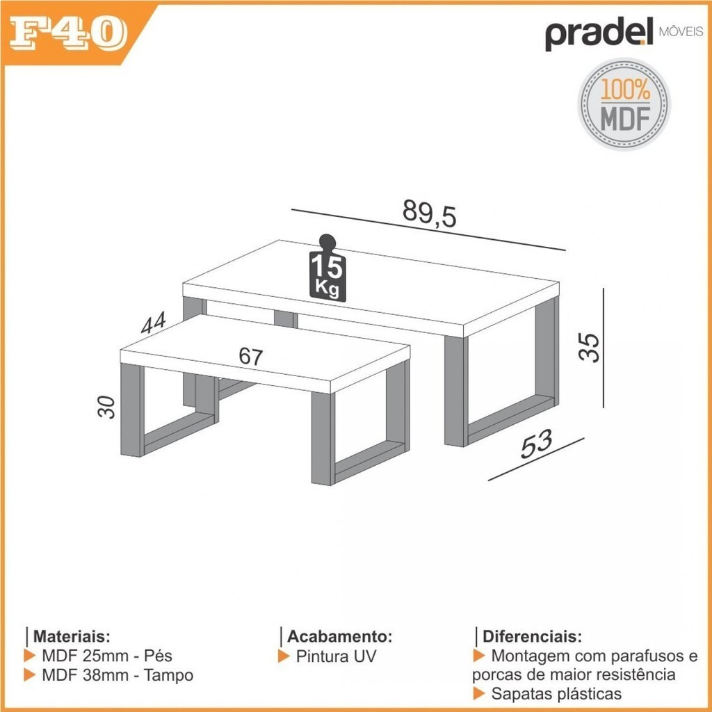 A Pradel traz o Conjunto de mesas de centro industrial F40 JPF na cor Freijó com Preto fosco. Com um design moderno e elegante, o móvel torna-se um complemento para a decoração da sua sala de estar, sala de jantar ou para seu quarto. O conjunto de mesas F40 tem estrutura 100% MDF, com um excelente acabamento proporcionando uma maior durabilidade ao móvel. Estilo: Industrial Formato: Retangular Peso (kg): 17.2 Garantia: 06 Meses Altura (cm): 35 Largura (cm): 89.5 Possui Portas: Não Possui Gavetas: Não Suporta Até (kg): 15 Possui Espelhos: Não Profundidade (cm): 53 Escala de Brilho: Fosco Serviço Montagem: 114259443 Material do Tampo: MDF Origem do Produto: Nacional Ambiente Principal: Sala de Estar Material Principal: MDF Possui Prateleiras: Não Marca: Pradel Móveis Cor do Produto: Freijó/Preto Itens Inclusos: 2 Mesas, Kit Ferragens e Manual de Montagem Cor Predominante: Marrom Quantidade de Gavetas: Não Possui