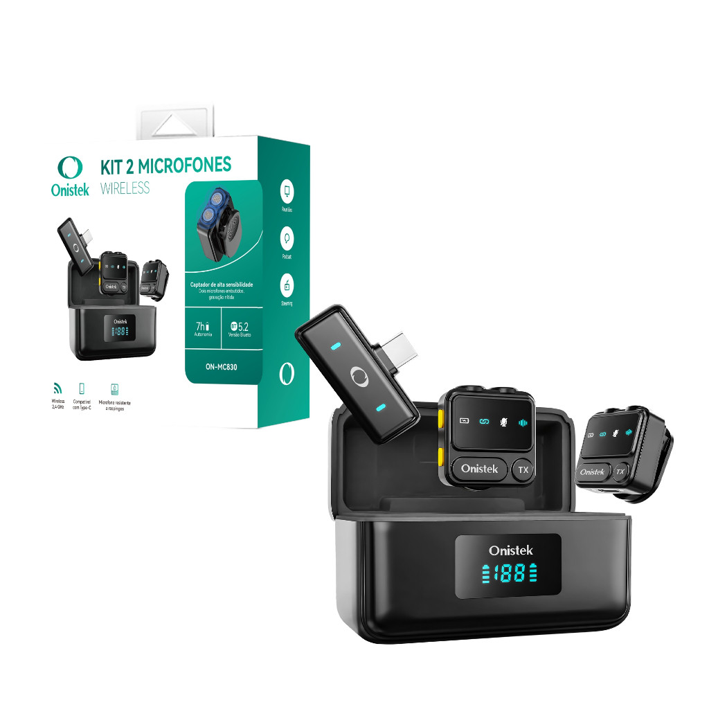 Eleve a qualidade do seu áudio com o Kit de Microfones Wireless ON-MC830. Este sistema profissional de dois microfones é ideal para criadores de conteúdo, streamers, jornalistas e vloggers que buscam mobilidade e clareza sonora sem a limitação de fios. Principais Funcionalidades: Conexão Estável: Equipado com a tecnologia Bluetooth 5.2, garantindo uma transmissão rápida e sem interferências. Liberdade de Movimento: Alcance de transmissão de aproximadamente 25 metros em áreas abertas. Resistência Prática: Certificação de resistência a respingos, ideal para gravações externas. Case de Carregamento Inteligente: Acompanha estojo de transporte que recarrega os microfones e possui display digital para monitorar o nível da bateria. Plug and Play: Interface Type-C moderna para conexão direta em smartphones e dispositivos compatíveis. Especificações Técnicas: Modelo: ON-MC830 Autonomia de Uso: Até 7 horas contínuas Tempo de Recarga: Aproximadamente 1 hora Interface de Carregamento: USB Type-C Distância de Transmissão: Aprox. 25m Capacidade da Bateria (Microfone): 80mAh Capacidade da Bateria (Case/Caixa): 600mAh Versão Bluetooth: 5.2 FAQ - Perguntas Frequentes: 1. O produto é compatível com quais dispositivos? O receptor possui conexão Type-C, sendo compatível com a maioria dos smartphones Android modernos, iPads e notebooks com entrada Type-C. 2. Posso usar os dois microfones ao mesmo tempo? Sim, o kit é "um para dois", permitindo que duas pessoas gravem simultaneamente com áudio independente. 3. Ele precisa de aplicativo para funcionar? Não, o sistema é Plug and Play. Basta conectar o receptor ao celular e ligar os microfones para começar a usar. 4. O display da case mostra a bateria de cada microfone? O display mostra o nível de carga da case de carregamento, garantindo que você saiba quando recarregar o estojo. Model Name:On-mc822 Registration ID:027462416010 Manufacturer:Dongguan Jialan Electronics Technology Co. Connection Type:Wireless Audio Compatibility:Mobile Microphone Type:Lapel Microphone