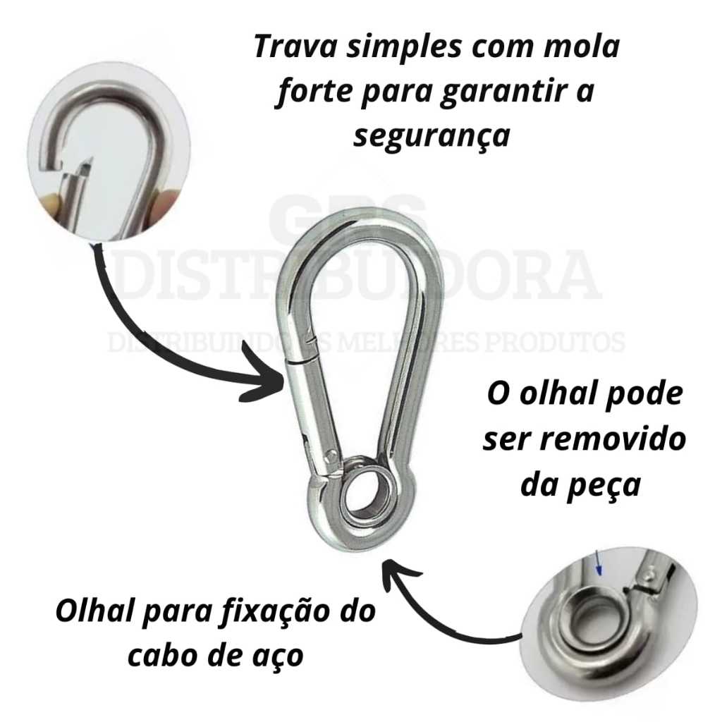 Especificações Técnicas Mosquetão * Material: Aço Carbono * Acabamento: Galvanizado * Comprimento total: 5 cm aproximadamente * Capacidade Carga Suportada: 100 kg * Com Olhal ** ENVIO IMEDIATO EM ATE 24 HORAS UTEIS **
