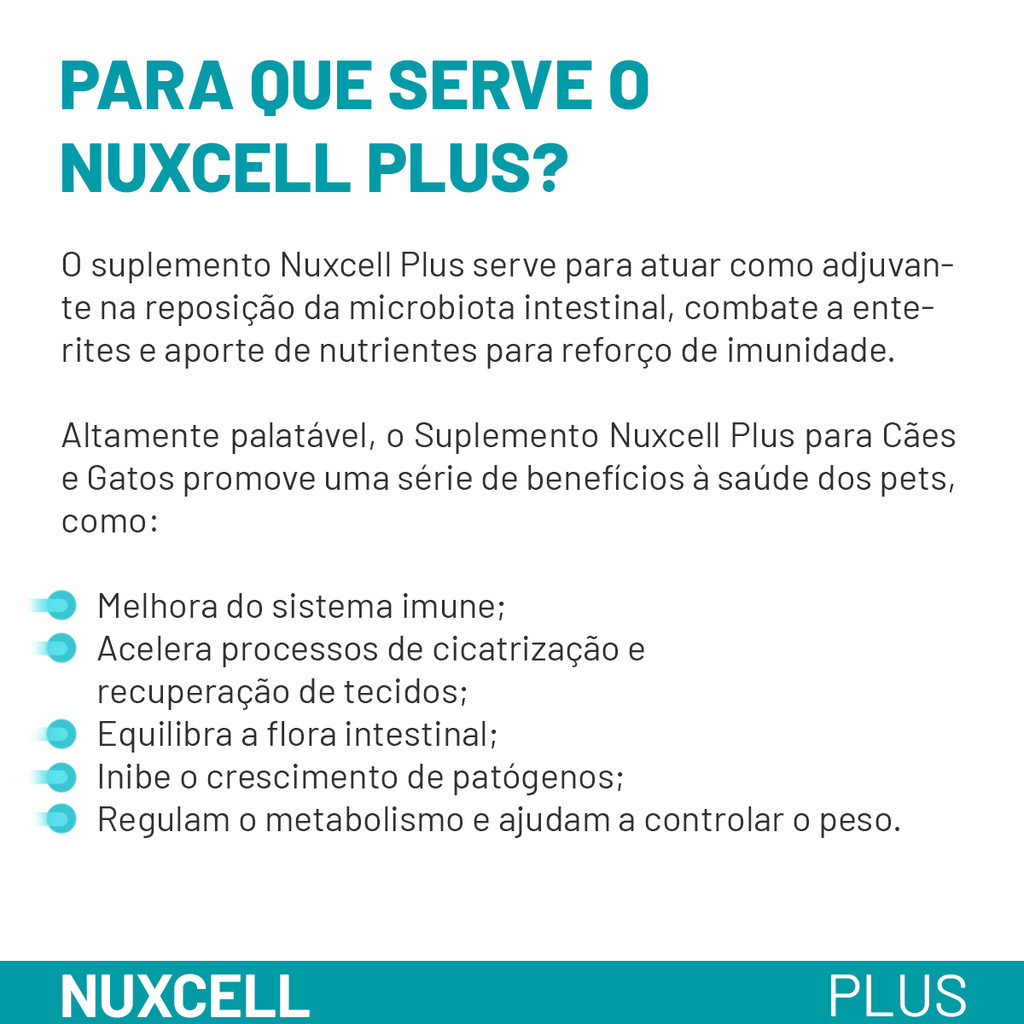 A LeluPets nasceu de uma paixão e dedicação de aproximadamente 20 anos de experiência nessa área tão incrível. Desde o início de nossa história, já são mais de 100 mil clientes atendidos. Estamos aqui determinados em fazer a diferença, democratizando e simplificando o cuidado com o seu pet para oferecer a melhor experiência para você e seu amiguinho. Mantemos nossas orelhas em pé, atentos às novidades do mundo pet para trazê-las até você. Nós somos apaixonados por pets! O seu pet é também da nossa família! Nuxcell Plus Suplemento Vitamínico Para Cães e Gatos BioSyn O Suplemento Vitamínico Para Cachorros e Gatos Nuxcell Plus é composto por vários nutrientes que atuam principalmente no sistema imunológico dos nossos bichinhos. Indicado para cães e gatos, com alguma doença que comprometa o sistema imunomodulador ou que estejam debilitados, também que possam apresentar alguma situação de estresse, pós-cirúrgicos... O suplemento auxilia também em um bom funcionamento gastrointestinal, previne anemias e reforça eficiência vacinal de nosso amigo. Nada melhor que ver nossos pets protegidos de doenças e se desenvolverem saudáveis e fortes nos trazendo muita alegria. - Indicado para Cachorros Gatos; -Suplemento Vitamínico; - Via oral de pronto uso; - Atente-se à NUXCELL PLUS bula e/ou informações da embalagem; - Consulte um médico veterinário de sua confiança para o uso apropriado deste produto; - Embalagem com 1 dose e acompanha 1 aplicador 2g.