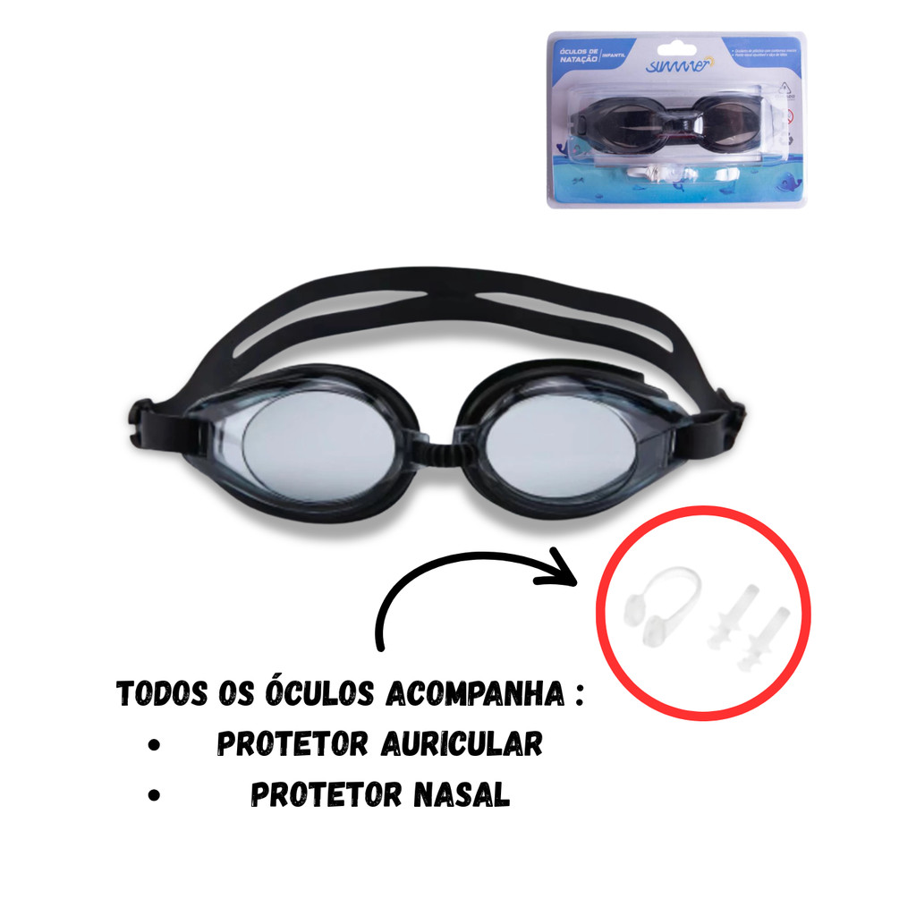 Conteúdo na Embalagem : 2 Óculos de Natação Infantil ; 2 Protetor Nasal e 2 Protetor de Auricular (Kit) Dimensões do Óculos: - Largura: 16 cm (aproximadamente) - Altura: 5 cm (aproximadamente) - Ajustável: Largura do nariz e cinta de cabeça são ajustáveis para maior conforto - Função Anti-nevoeiro: Não limpe o lado interno das lentes para preservar o efeito anti-nevoeiro; umedeça o lado interno antes de usar ATENÇÃO: Lembre-se sempre que as crianças devem estar sob a supervisão de um adulto ao entrar na água. Nunca deixe a criança entrar sozinha. Com óculos de mergulho, protetor nasal e protetor de ouvido, este conjunto foi desenvolvido para garantir conforto, proteção e visibilidade subaquática, permitindo que as crianças desfrutem da água com segurança