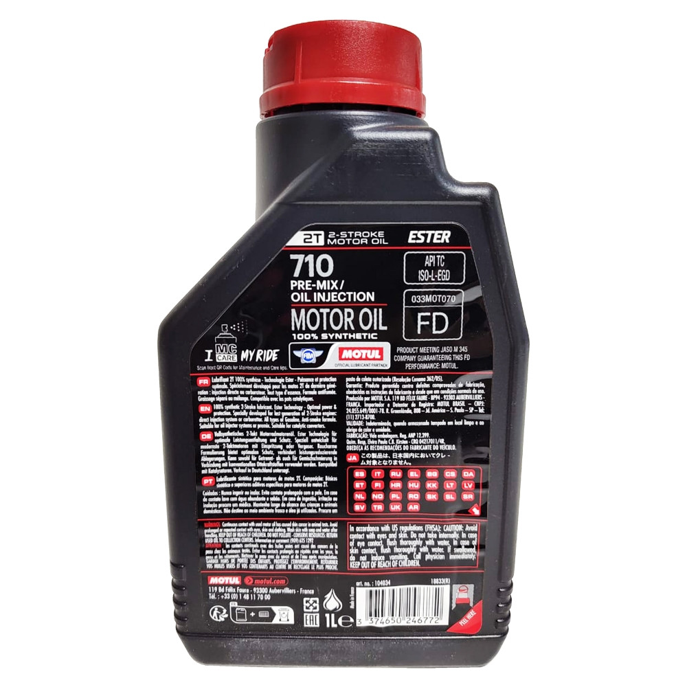 KIT 2 OLEO MOTUL 710 2T Descrição Todas as motocicletas com motor 2 tempos de alto desempenho, esportivas, réplicas, de trilha, fora-de-estrada, enduro, motonetas, e outras equipadas com motores 2 tempos de alto desempenho e que operam em alto giro e em condições severas, com injeção direta ou carburador. Adequado para sistemas com injetor de óleo ou por mistura prévia na gasolina com ou sem chumbo. Compatível com catalisadores. Outros usos: scooters, quadriciclos e outros. Aplicação Motor Tipo de Motor 2T Tipo de produto 710 Qualidade FULL SYNTHETIC Viscosidade NC Normas API API TC, ISO -L-EGD, JASO FD - 033MOT070 Foto Ilustrativa O KIT 2 ÓLEO MOTUL 710 2T: Um Imprescindível para o Desempenho da Sua Moto - Encontre na Paulinho Motos Encontre o KIT 2 ÓLEO MOTUL 710 2T ideal na Paulinho Motos. Garantia de qualidade e performance para sua moto. Compre agora e mantenha seu motor protegido