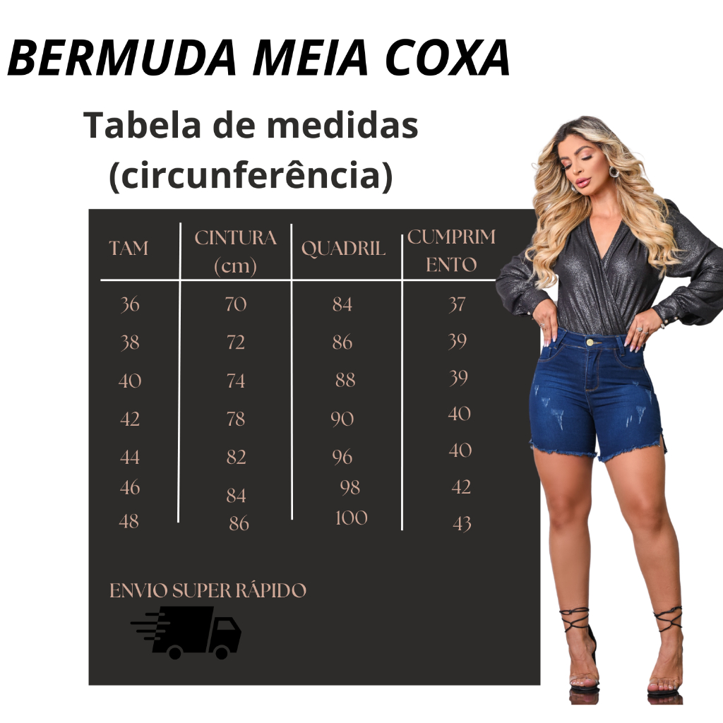 👖 Bermuda Jeans Feminina Short Meia Coxa Cintura Alta Abertura Lateral Botão Com Zíper Levanta Bum Bum 👖 ✔️ Estilo Inconfundível: Esta bermuda jeans é projetada para realçar suas curvas com um efeito levanta bum bum. A cintura alta e a abertura lateral com botão e zíper adicionam um toque único e moderno ao design. ✔️ Conforto e Praticidade: Feita com tecido de alta qualidade que inclui Lycra, esta peça oferece flexibilidade e conforto para o uso diário, sem sacrificar o estilo. Compre com Segurança: Estoque Pronto para Envio: Todas as peças estão disponíveis para pronta entrega. Envio Rápido: Enviamos seu pedido em até 24 horas úteis. Qualidade Garantida: Cada peça é cuidadosamente conferida antes do envio para garantir a sua satisfação. Qualquer dúvida, entre em contato conosco pelo chat! Estamos a disposição! 📏 Medidas Detalhadas: Tamanho 36 - Cintura: 70cm | Quadril: 84cm | Comprimento: 37cm Tamanho 38 - Cintura: 72cm | Quadril: 86cm | Comprimento: 39cm Tamanho 40 - Cintura: 74cm | Quadril: 88cm | Comprimento: 39cm Tamanho 42 - Cintura: 78cm | Quadril: 90cm | Comprimento: 40cm Tamanho 44 - Cintura: 82cm | Quadril: 96cm | Comprimento: 40cm Tamanho 46 - Cintura: 84cm | Quadril: 98cm | Comprimento: 42cm Tamanho 48 - Cintura: 86cm | Quadril: 100cm | Comprimento: 43cm 🚀 Entrega Rápida e Segura: Com processos logísticos otimizados, garantimos que seu pedido seja entregue de forma rápida e segura. 💬 Suporte ao Cliente: Está com dúvidas? Nosso serviço de atendimento está pronto para auxiliar você em qualquer questão sobre seu pedido ou nossos produtos.