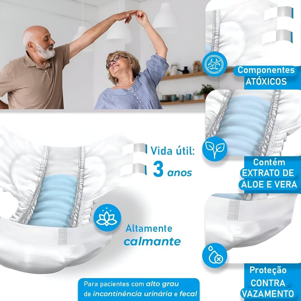 Fralda Geriátrica Descartável Adulto XG Felt Care com 46 Unidades A Fralda Geriátrica XG Felt Care é um produto projetado para uso em pacientes com grau de incontinência urinária e fecal moderada, desenvolvida para garantir proteção com conforto, segurança contra vazamentos e cuidado com a pele. Composição química: Fralda Geriátrica XG Felt Care Estrutura formada de camada interna de tecido não tecido de fibras de polipropileno com Aloe vera, camada externa de polietileno, fibra de celulose, polímeros superabsorventes (poliacrilato de sódio), barreiras protetoras de fibras de polipropileno, fios de elastano, adesivos termoplásticos e fitas adesivas para fixação. Propriedades e características gerais: - Camadas de distribuição para rápida distribuição do líquido, menor tempo de contato com a pele e redução do retorno do líquido; - Barreiras protetoras proporcionando maior segurança contra vazamentos laterais; - Formato anatômico para maior conforto em contato com a pele; - Cobertura interior de não tecido, com Aloe Vera, tornando a cobertura macia ao toque na pele e promovendo a sensação calmante; Tamanho: XG Peso (Kg): 90-150 kg Cintura (cm): 110-165 cm Absorção (Gramas): 1094-1377 gr.