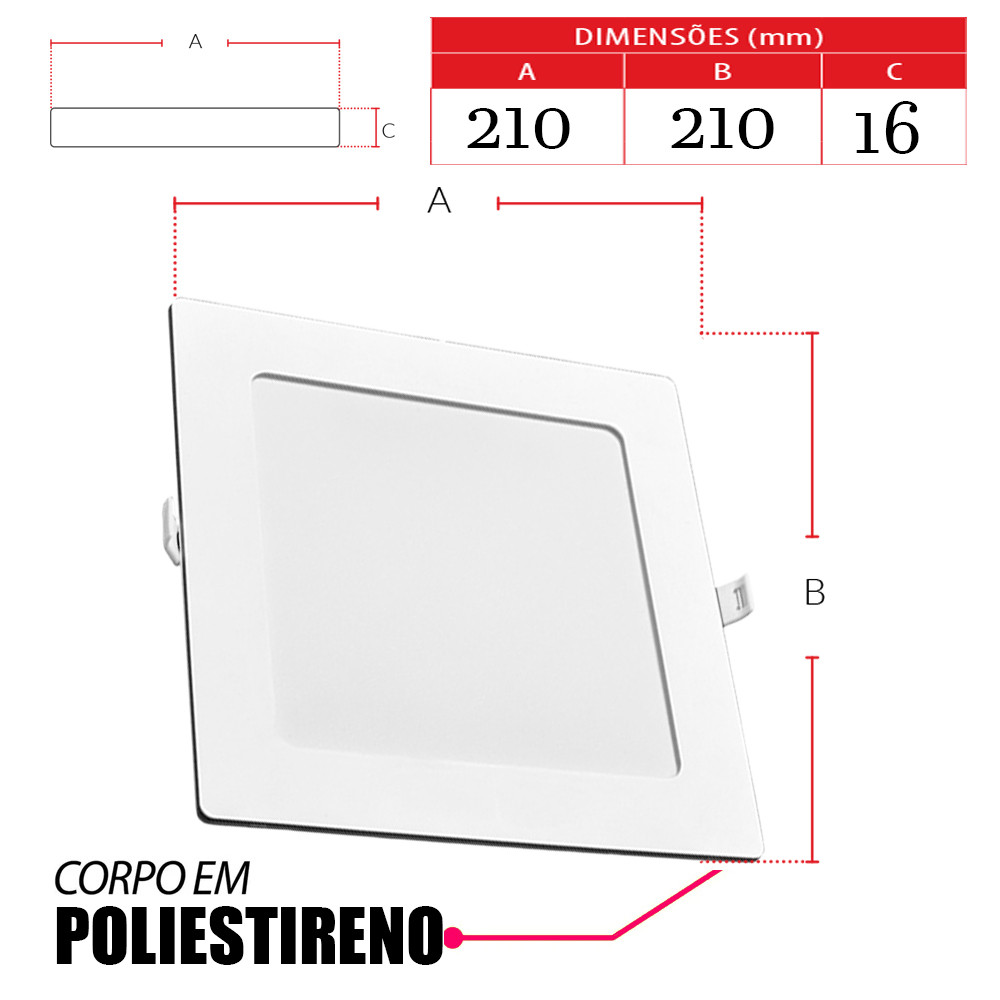 Kit 2 Unidades do Painel Pop de Embutir Quadrado Avant O PAINEL POP DE EMBUTIR AVANT é versátil e pode ser usado em ambientes residenciais, comerciais e corporativos, proporcionando uma iluminação homogênea com design leve e moderno. Fluxo luminoso constante em toda faixa de tensão. Baixo consumo de energia. Informações Técnicas: Código: 903010575 Marca: Avant Potência: 18W Tensão: 127v/220v Bivolt Automático Emissão de Luz: Amarela Temperatura da Cor: 3000K Fluxo Luminoso: 1080 Lumens Eficiência Luminosa: 70 Lm/Watts Temperatura ambiente: -5°C a 40°C. Fator de potência: =0,50 Dimerizavel: Não Índice de Proteção: IP20 Tipo de instalação: Embutir Material: Poliestireno Vida útil Aproximada: 25 Mil Horas Garantia: 12 Meses Dimensões Aproximada: 210x210x16mm ATENÇÃO: Na instalação do transformador eletrônico, certifique-se de que o mesmo não ficará em contato com a luminária, pois toda a base da luminária funciona como dissipador de calor, o que pode causar danos e interferências no funcionamento do transformador.