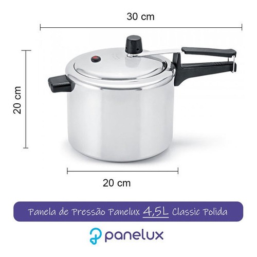 A panela de pressão polida é produzida com alto padrão de qualidade que oferece segurança e um melhor desempenho na sua cozinha. Além do pino central controlador de pressão, possui uma válvula de segurança em silicone. Ambas trabalham em conjunto para um melhor controle interno da pressão, evitando acidentes e proporcionando um cozimento rápido e na temperatura ideal. Tanto o cabo e a alça são fabricados em baquelite, material durável e que resiste a altas temperaturas, característica que além de proporcionar uma maior vida útil para a panela trará mais segurança no transporte, como quando ainda com a refeição em seu interior ela precisa ser levada do fogão à mesa. Conteúdo da embalagem 1 Panela de Pressão 3L Altura (cm): 19 - Largura (cm): 15 - Comprimento (cm): 30 Peso (kg): 0.8500 1 Panela de Pressão 4,5 Litros Altura (cm): 20 - Largura (cm): 20 - Comprimento (cm): 30 Peso (kg): 0.9650 Especificações Técnicas Linha: Classic Material: Alumínio Material do cabo: Baquelite Material da alça: Baquelite Acabamento: Polido Capacidade: 3 litros e 4,5 litros Pino controlador: Central Cozimento: Rápido Padrão de qualidade: Alto Possui válvula de segurança: Sim Tipo de válvula: Silicone Tipo de fechamento: Interno Pode ir a lava louças: Sim Certificado inmetro: 001509/2018 Marca: Panelux