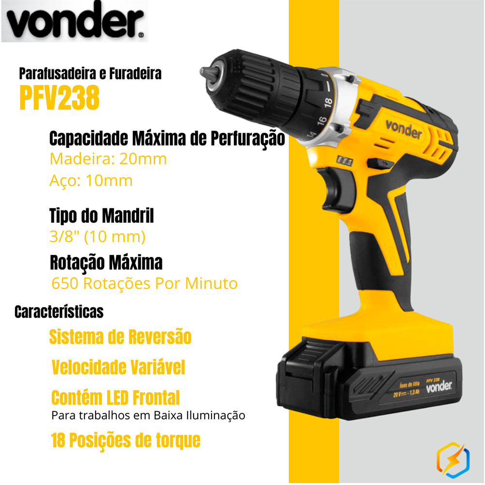 Você estará comprando: 02 Parafusadeira Furadeira 02 Bateria 20v 02 Carregador Bivolt Automático (110v/220v) 12 Brocas de Aço Rápido (1.5mm, 2.5mm, 3.0mm, 4.0mm, 5.0mm e 6.0mm) 04 Bits Fenda de 5 e 6mm 04 Bits Phillips PH1 e PH2 04 Bits Pozidrive Pz1 e PZ2 02 Adaptador Magnético para Bits (Encaixe 1/4 Pol.) 02 Maleta Furadeira Parafusadeira 20V PFV 238 Vonder com Maleta e Acessórios Realize seus trabalhos com muito mais eficiência, organização e praticidade! A Furadeira/Parafusadeira Vonder PFV 238 20V é a ferramenta ideal para apertar e soltar parafusos de até 8 mm e realizar furos em madeira e metais com excelente desempenho. Com design moderno e ergonômico, oferece 18 níveis de torque + 1 para perfuração, garantindo precisão em diferentes tipos de materiais e aplicações. Seu LED integrado proporciona melhor visibilidade no local de trabalho, enquanto o indicador de carga facilita o controle de uso da bateria. Acompanha maleta com acessórios organizados, garantindo praticidade, proteção e maior vida útil das peças. A bateria Íons de Lítio 20V (1,3Ah) proporciona alta durabilidade e autonomia, incluindo carregador bivolt automático 110v/220v. Informações Técnicas: Modelo: PFV 238 Código: 6001238000 Marca: Vonder Tensão da Bateria: 20V (1,3 Ah) Tipo de Bateria: Íons de lítio Carga da Bateria: 1,3 Ah Indicador de Nível da Carga da Bateria: Sim Tensão do Carregador: 110v/220v Bivolt Automático Frequência: 50 Hz / 60 Hz Tempo de Carregamento da Bateria Aproximado: 3 a 5 Horas Capacidade do Mandril: 3/8 Polegada (10mm) Tipo de Mandril: Aperto rápido Posições de Torque: 18 + 1 Para Perfuração Iluminação LED: Sim Sistema de Reversão: Sim Tipo de Velocidade: Variável Diâmetro Máximo do Parafuso: 8mm Rotação da furadeira/parafusadeira: 0-650/min Capacidade máxima de perfuração em madeira: 20,0 mm Capacidade máxima de perfuração em aço: 10,0 mm Aceleração transmitida nas mãos - braços do operador - ah: 9,5 m/s² Incerteza da aceleração transmitida nas mãos - braços do operador - k: 1,5 m/s² Segue norma: ABNT NBR IEC 60745-1, ABNT NBR IEC 60745-2-1 e ABNT IEC 60745-2-2 Peso Aproximado: 2,8kg Garantia: 90 dias + Garantia contratual: 9 meses