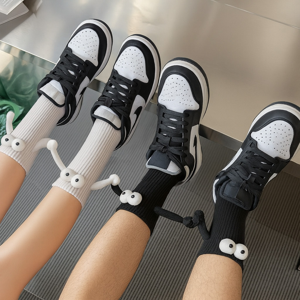 Meia divertida com olhos 3D e detalhes pendurados, perfeita para quem ama conforto com um toque de criatividade! Confeccionada em tecido macio, cano médio, ideal para uso casual com tênis, chinelos ou sandálias. Design unissex e versátil para todas as idades. Destaque-se com um visual despojado e cheio de personalidade! CONTÉM: 2 PARES DE MEIA: 1 BRANCO E 1 PRETO (KIT CASAL, OU AMIGOS) Não Trocamos as cores, é enviado um preto e um branco.