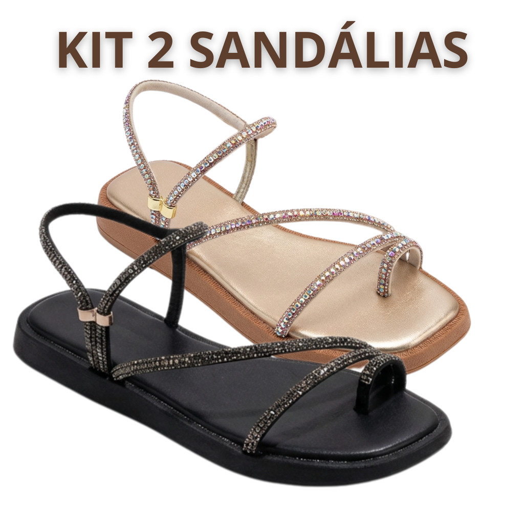 Kit 2 Pares Papete Feminina Rasteira com Strass Brilhante Tiras Finas Ajustável Confortável L