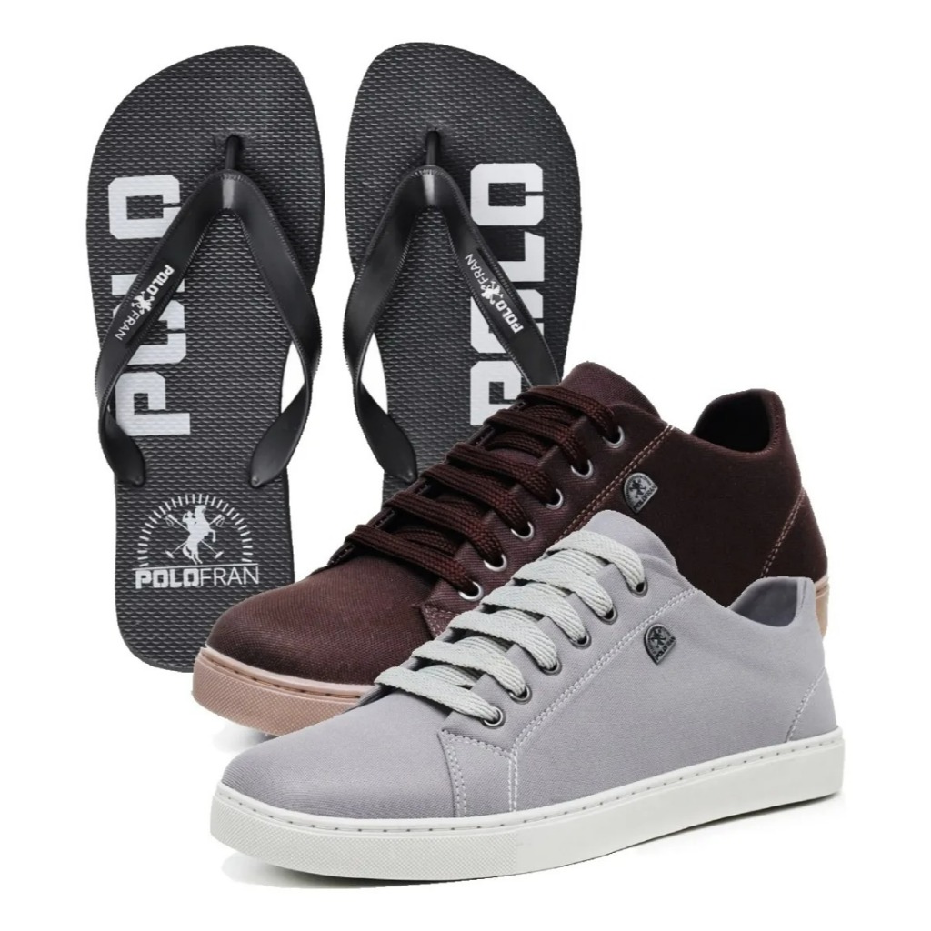 ATENÇÃO: CORES VARIADAS DE ACORDO COM NOSSO ESTOQUE! Escolha o seu tamanho: Os calçados possuem numeração padrão, então selecione o número que você calça normalmente e tenha certeza de que ficará perfeito! Itens Incluídos no Kit: 2 Pares de Tênis PoloFran 1 Par de Chinelo PoloFran Detalhes do Tênis: Material: Lona de alta qualidade Interno: Forração acolchoada com espuma, proporcionando conforto durante todo o dia Design: Detalhe em metal da PoloFran na lateral Solado: Borracha costurada, garantindo reforço e durabilidade Fechamento: Cadarço largo para um ajuste seguro Detalhes do Chinelo: Material: PVC leve e resistente Palmilha: Acolchoada para maior conforto Design: Estilo moderno, ideal para o dia a dia Solado: Antiderrapante, garantindo segurança em qualquer superfície Se tiver alguma dúvida, não hesite em nos consultar na seção de perguntas!