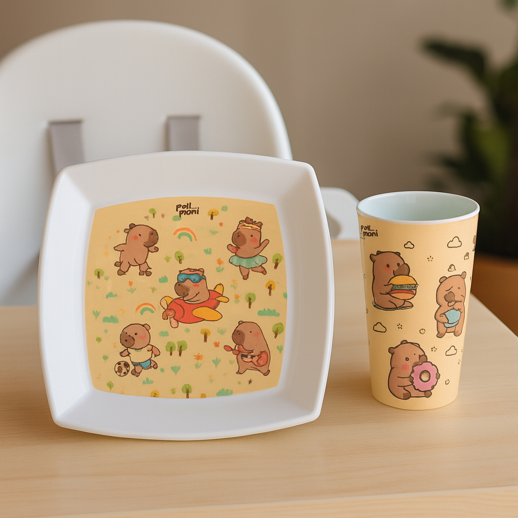 Kit 2 Pçs Primeira Refeição Capivara Prato Copo Plástico Criança Infantil Creche Merenda