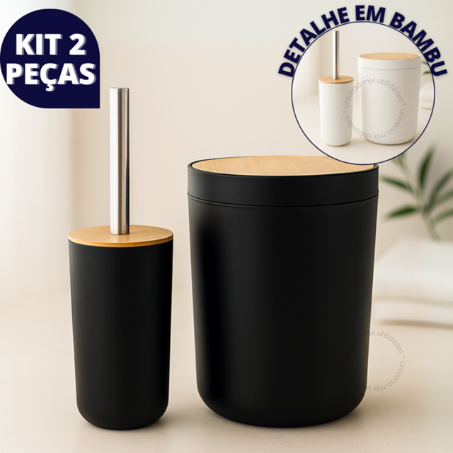 Kit 2 Peças Banheiro Lixeira C/ Tampa Escova Sanitaria Detalhes Em Bambu Luxo