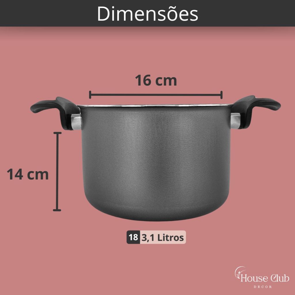 A escolha perfeita para quem busca eficiência, durabilidade, praticidade e beleza na cozinha! Kit 2 Peças um item indispensável para sua cozinha, acompanha Caldeirão 18 cm Antiaderente com Tampa de Vidro Temperado, com saída de vapor e borda de Aço Inox, que proporciona a visualização do processo de cozimento dos alimentos e Caneco Ferverdor 16 cm de diâmetro. Esse item oferece uma experiência culinária completa! O grande diferencial está no seu material, Alumínio de alta qualidade, espessura de 1,1 mm que confere ao item uma estrutura resistente, garantindo a durabilidade mesmo com uso intenso. Com distribuição eficiente do calor promove um cozimento rápido e uniforme dos alimentos, proporcionando resultados incríveis em suas preparações. Revestimento interno e externo, com 5 Camadas de Antiaderente TEFLON (DuPont) - PFOA Free (livre de substâncias tóxicas - ausência de elementos nocivos à saúde). Essa superfície antiaderente eficaz evita que os alimentos grudem, facilitando o cozimento e a limpeza. Além disso, essa característica permite o preparo dos alimentos com menos gordura, promovendo uma alimentação mais saudável e prática. Cabo ergonômico reforçado feito em baquelite, material antitérmico que não retém calor, o que permite cozinhar com conforto e tranquilidade, evitando acidentes na cozinha. Aproveite! Adquira o seu e experimente uma nova forma de cozinhar, esse item oferece praticidade e eficiência, além de funcional, compõe a decoração com seu design moderno, agregando charme e sofisticação ao ambiente. Transforme suas refeições em momentos especiais! Conteúdo: Dimensões aproximadas - cm: (Altura x Largura x Comprimento – Capacidade volume): - 1 Caldeirão 18 cm de diâmetro c/ tampa de vidro –12,5 x 18 x 31 – 3,0 Litros - 1 Caneco Fervedor 16 cm de diâmetro – 12 x 16 x 20 – 2,3 Litros - Material: Alumínio Revestimento Antiaderente Teflon - Externo - Cor: Grafite Preto - Interno - Cor: Grafite Preto - Espessura Material: 1,1mm - Cabo: Baquelite - Tampa: Vidro Temperado - Peso do Produto: 972g Dimensões aproximadas da embalagem (AxLxC): 19 x 26 x 32 cm - Peso Embalagem - Caixa Parda: 148g Antes do primeiro uso: É imprescindível realizar a Limpeza e Cura do item, essencial para a proteção e durabilidade da camada antiaderente. Instruções: Lave o item, com esponja macia e detergente neutro, seque com um pano limpo. Unte a parte interna com óleo e leve ao fogo baixo por 2 minutos. Deixe esfriar, lave, enxugue e está pronta para utilizar. Cuidados e Recomendações: - Lave com detergente neutro e esponja macia; - Para secar, utilize um pano seco e macio; - Nunca utilize produtos solventes ou abrasivos; - Evite a imersão do produto quente em água fria, deixe esfriar antes de lavar; - Para mexer os alimentos use somente utensílios de silicone ou nylon; - Não pode ser levada ao forno e/ou micro-ondas; - Não exponha as alças e cabos diretamente ao fogo ou fonte de calor prolongado; - Mantenha o produto sobre a chama do fogão apenas o necessário para o cozimento, sempre em fogo baixo ou médio (nunca superior a 350°C). Detalhes: - Itens decorativos não acompanham o produto. Imagens meramente ilustrativas; - Para descarte dos produtos e embalagens siga as orientações de reciclagem vigente; - Pode conter pequena variação na cor do produto dependendo das configurações da tela do seu computador ou smartphone. Agradecemos a sua visita e aguardamos seu pedido! É uma grande satisfação ter você como cliente. Estamos à disposição para qualquer dúvida. Atenciosamente, Equipe House Club Decor