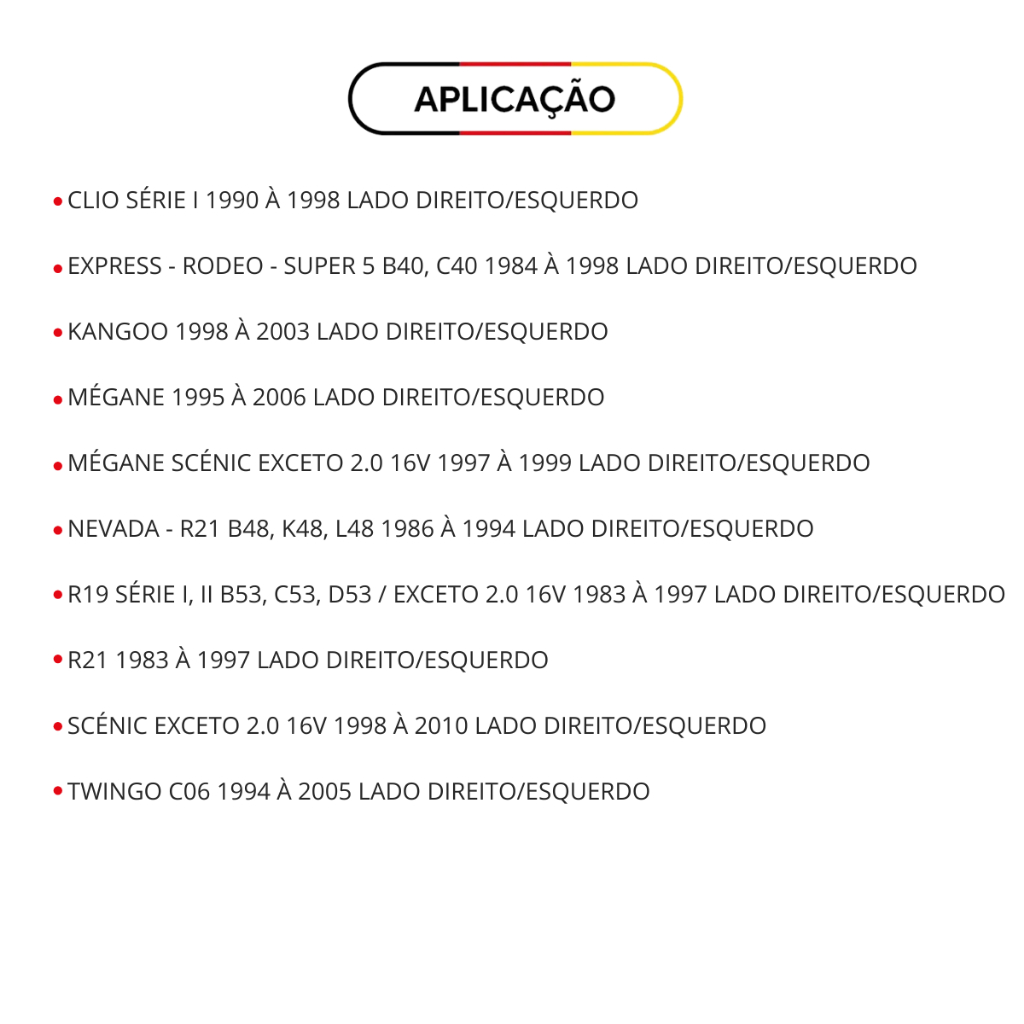 O Pivo da Bandeja de Suspensão da Besser Store é a escolha ideal para quem busca qualidade e durabilidade em componentes automotivos. Este produto é compatível com diversos modelos, incluindo Clio, Megane, Twingo e Kangoo, garantindo uma excelente performance em diferentes veículos. Com um design ajustável, o pivo proporciona uma instalação fácil e eficiente, permitindo que você mantenha a suspensão do seu carro em ótimo estado. A inclusão de uma capa de poeira assegura a proteção do componente, aumentando sua vida útil e desempenho. Desenvolvido para carros e caminhonetes, este pivo é essencial para garantir a segurança e estabilidade do seu veículo. Invista na qualidade e na confiança que a Besser Store oferece, e experimente a diferença na sua condução. APLICAÇÃO: CLIO SÉRIE I 1990 À 1998 LD/LE EXPRESS - RODEO - SUPER 5 B40, C40 1984 À 1998 LD/LE KANGOO 1998 À 2003 LD/LE MÉGANE 1995 À 2006 LD/LE MÉGANE SCÉNIC EXCETO 2.0 16V 1997 À 1999 LD/LE NEVADA - R21 B48, K48, L48 1986 À 1994 LD/LE R19 SÉRIE I, II B53, C53, D53 / EXCETO 2.0 16V 1983 À 1997 LD/LE R21 1983 À 1997 LD/LE SCÉNIC EXCETO 2.0 16V 1998 À 2010 LD/LE TWINGO C06 1994 À 2005 LD/LE Nº REFERÊNCIA: COFAP: PSC18002M DRIVEWAY: JE4642 NAKATA: N9082 PERFECT: PVI2182 RENAULT: 7701400000 RENAULT: 7701162182 SKF: VKDS4726 TRW: PS1015 VIEMAR: 503010 Garantia do vendedor: 90 dias