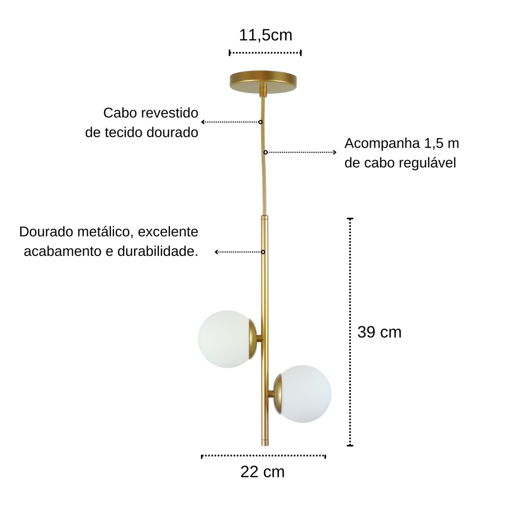 –KIT COM DOIS PENDENTES JABUTICABA DOURADO / 2 GLOBOS– * Minimalista - Contemporâneo - Moderno * * Cabeceira - Quarto - Lavabo - Cozinha - Bancada - Mesa * - Luminária em alumínio, alta durabilidade em regiões litorâneas. - Pintura na cor dourada metálica, com excelente acabamento. - 2 globos de vidro com 10 cm, na cor branca fosca. - Utiliza lâmpada tipo g9, padrão facilmente encontrado. - Não acompanha lâmpada. - Cabo PP dourado revestido com tecido com 1,5 metros, com fácil sistema de regulagem, tornando a luminária adaptável a qualquer ambiente. - Dimensões (luminária): altura: 39 cm (+ 1,5m de cabo ajustável). largura: 22 cm - Produto bivolt. - Luminária a pronta entrega, com embarque imediato. Um produto produzido no Brasil. ''Feito a mão, com toda a atenção aos detalhes e com o mesmo carinho que nosso pai sempre colocou em nossa empresa, desde 1979.''