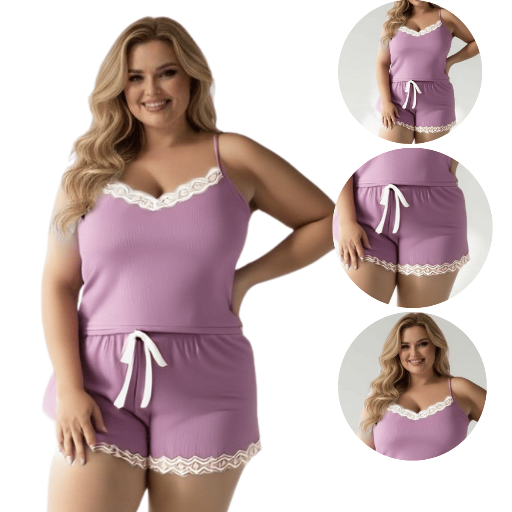 KIT 2 Pijama Feminino Plus Size Suede Canelado Sexy com Detalhe de Renda Luxo Canelado Premium