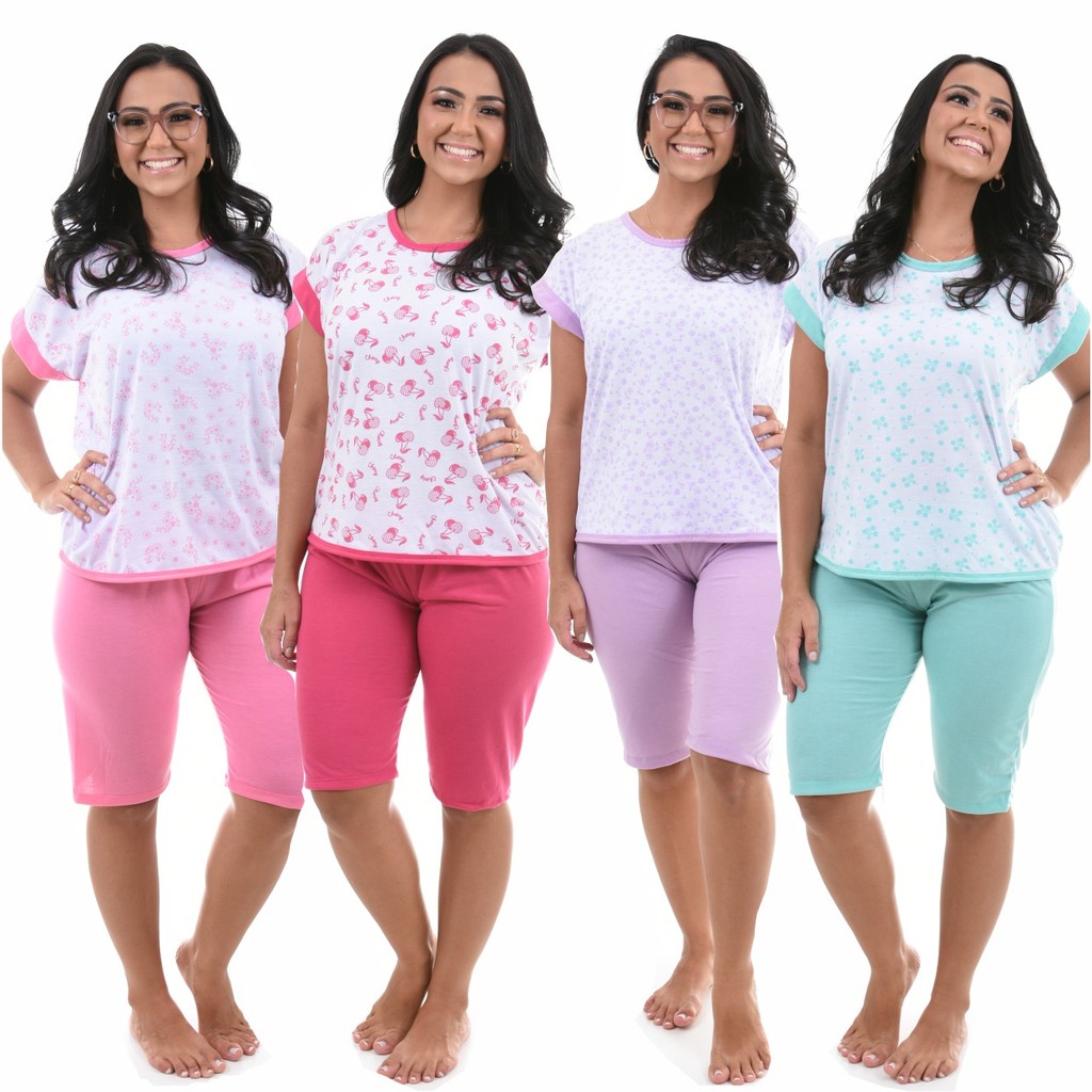 KIT CONTÉM 2 PIJAMAS PESCADOR As cores são enviadas de forma sortida. Não se preocupe que enviamos cores diferentes. Pijama com camisa com manguinha curta e calça curta capri, pescador. Modelo super confortável e prático. Ideal para quem procura conforto. Modelo muito usado por senhoras. MATERIAL: Malha PV Premium >> TAMANHOS E TABELA DE MEDIDAS: P (38/40): BLUSA: Largura: 102 cm // Altura: 61 cm BERMUDA: Largura normal: 64 cm // Largura esticada: 108 cm // Altura: 55 cm M (42/44): BLUSA: Largura: 106 cm // Altura: 64 cm BERMUDA: Largura normal: 70 cm // Largura esticada: 116 cm // Altura: 58 cm G (46): BLUSA: Largura: 112 cm // Altura: 68 cm BERMUDA: Largura normal: 70 cm // Largura esticada: 116 cm // Altura: 62 cm GG (48): BLUSA: Largura: 120 cm // Altura: 70 cm BERMUDA: Largura normal: 78 cm // Largura esticada: 126 cm // Altura: 63 cm OBS: A largura da blusa é a circunferência (frente e costas) na parte do busto, logo em baixo da costura da manga. Até o final da blusa a medida é a mesma. As medidas apresentadas são para melhor auxiliar na hora da compra, mas as modelagens são padrões de cada tamanho. As medidas podem apresentar pequenas variações para mais ou para menos. Para finalizar a compra existe somente uma opção de cor já selecionada. Essa cor é padrão. Somente para finalizar a compra, não indo necessariamente essa opção, pois as cores são variadas. As fotos são ilustrativas. Cores/estampas podem sofrer variações.