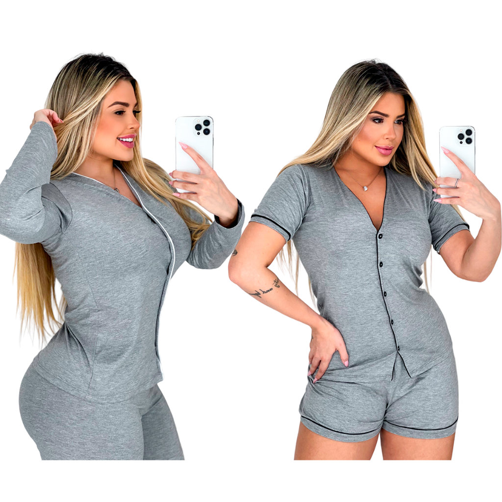 Kit 2 com Pijamas Americano 1 Modelo longo de inverno com calça e Camisa manda longa , 1 Modelo curto com shorts Baby Doll Pijama Feminino Americano Blogueira Aberto Com Botões adulto curto Veste super bem, ótimo acabamento. Tecido muito gostoso veste bem no corpo Tecido 94% Viscose com 6% de Elastano temos pronta entrega todas as cores nos tamanho do P ao GG confira a tabela de metida na ultima foto do anuncio Todos os tamanho disponível envio imediato