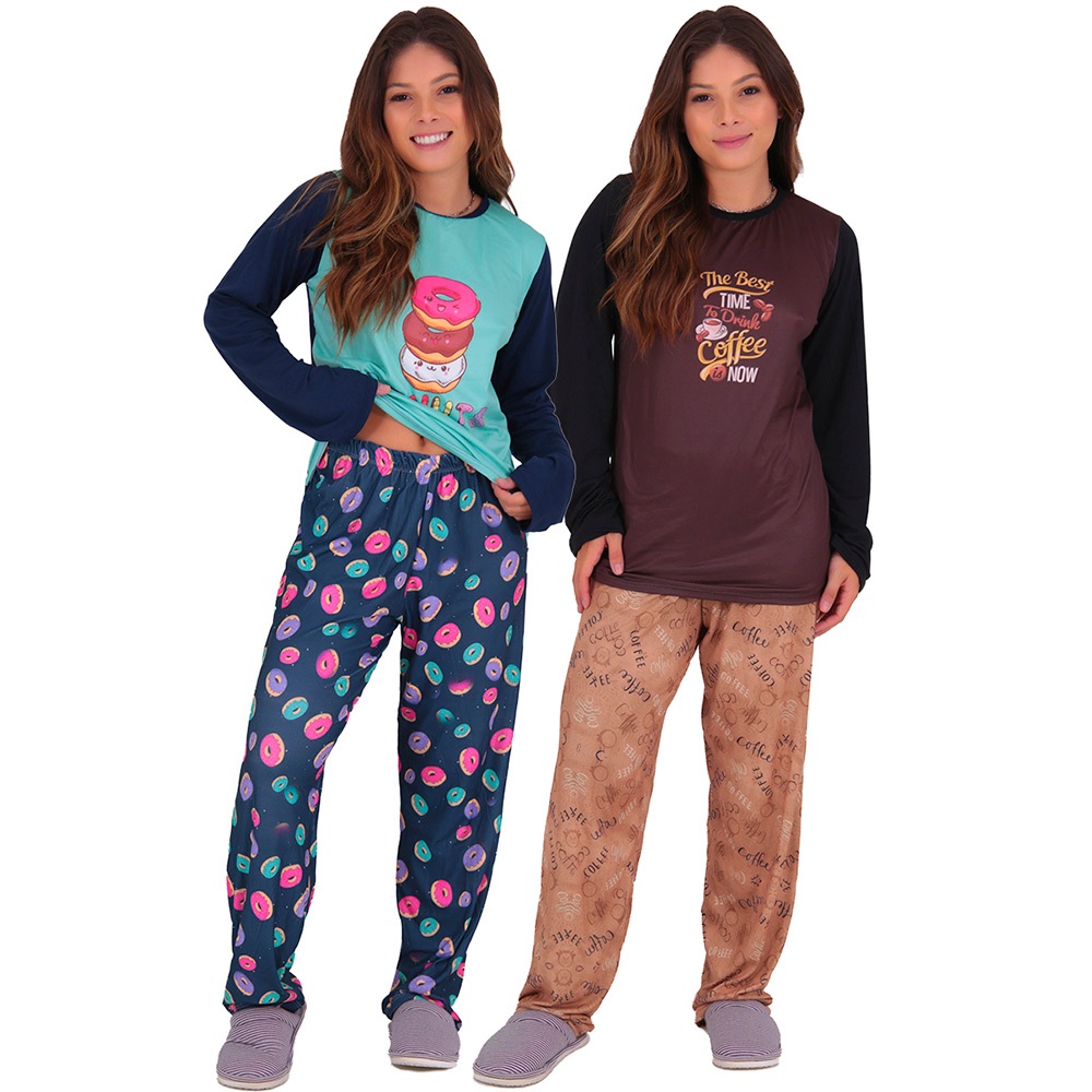 KIT 2 Pijamas Manga Longa Feminino Suede Felpada Layla