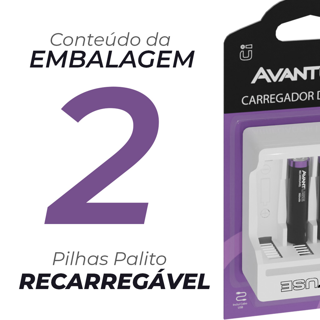 Kit 2 Pilhas Recarregável AAA Palito + Carregador Avant Use