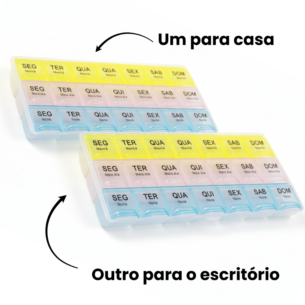 O Kit com 2 Porta Comprimidos Semanal é a solução definitiva para organizar sua rotina de medicamentos com máxima segurança e praticidade. Chega de confusão ou doses inadequadas! Desenvolvido para facilitar a vida de idosos, pessoas com rotinas intensas ou viajantes, este organizador garante que você tome o remédio certo, na hora certa, todos os dias. Com compartimentos separados para Manhã, Tarde e Noite, e um design compacto e portátil, ele cabe em qualquer bolsa, sendo ideal para casa ou para levar em suas viagens. 💊 Destaques do Produto: O Fim dos Esquecimentos! ✅ Organização 3x ao Dia: Cada dia da semana possui 3 compartimentos (Manhã, Tarde e Noite) para total precisão. ✅ Ideal para Idosos e Rotina: Facilita o manejo diário, prevenindo esquecimentos ou confusões de doses. ✅ Compacto e Portátil: Leve e com tamanho perfeito para ser transportado em bolsas, mochilas ou até bolsos. ✅ Abertura Fácil: Projetado para ser prático, mesmo para pessoas com dificuldades motoras. ✅ Material de Alta Resistência: Reutilizável e durável, garantindo longa vida útil ao seu organizador. ✅ Kit Econômico com 2 Unidades: Valor excepcional para organizar duas rotinas diferentes ou ter um extra para viagens. ✅ Encaixe Perfeito para Remédios: Amplo espaço para acomodar diferentes tamanhos de pílulas e cápsulas. 📦 O Que Você Receberá: ✅ 2 Porta Comprimidos Semanal 3x ao Dia (Manhã, Tarde e Noite) ✅ 1 Nota Fiscal (NF-e) 🛒 Informações de Compra e Garantia: Seu pedido tem prioridade! Trabalhamos com Envio Imediato para garantir que você receba seu organizador o mais rápido possível. ➡️ ATENÇÃO: Pedidos realizados e confirmados até as 11:00 (horário de Brasília) serão postados no mesmo dia útil. Garantia Total: Oferecemos 3 meses de garantia contra defeitos de fabricação. Compra Segura: Todos os produtos são enviados com a Nota Fiscal de Compra, garantindo seus direitos como consumidor e a procedência do item.