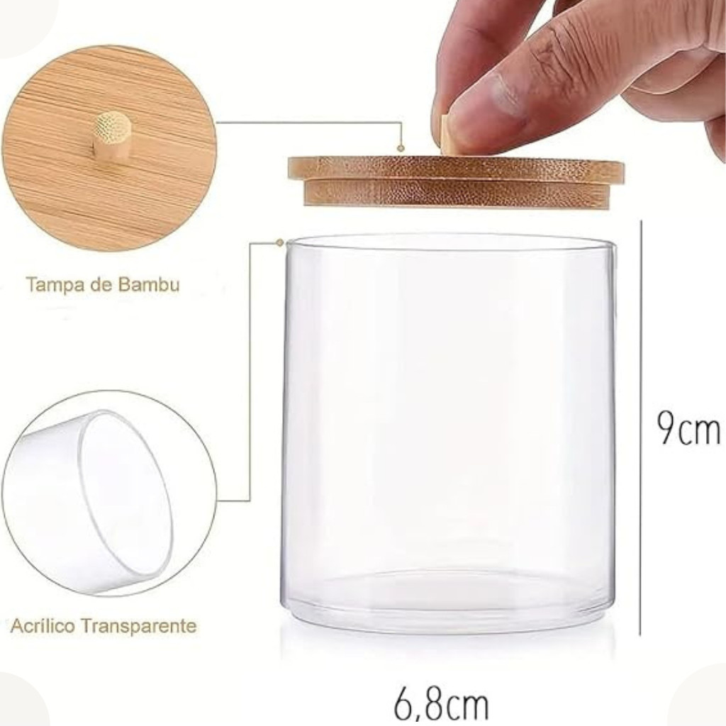 | Kit 2 Porta Cotonete Algodão Acrílico Tampa Bambu Multiuso este produto | R$ 29,90 | — | 5.0/5 | 4 |