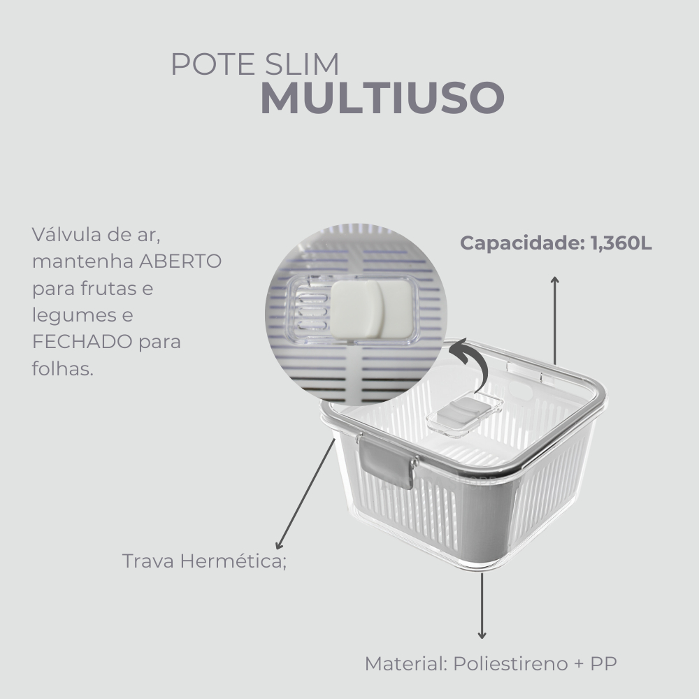 Pote Hermético Slim com Tampa com Trava – 1,36 Litros. Ideal para quem busca praticidade sem abrir mão da organização! Com design compacto e formato slim, este pote hermético é perfeito para armazenar porções individuais, lanches ou refeições prontas, ocupando pouco espaço na geladeira ou na bolsa térmica. A tampa com trava garante vedação eficiente, impedindo a entrada de ar e mantendo os alimentos frescos por mais tempo. Feito com material resistente e fácil de limpar, é o aliado ideal para a rotina corrida do dia a dia. Destaques do Produto: Capacidade de 1,36L ideal para lanches e porções Formato compacto que otimiza o espaço Tampa com trava para vedação segura Design moderno e funcional Especificações Técnicas: Dimensões: 8,9 cm (A) x 16,5 cm (C) x 15,4 cm (L) Peso: 237 g Capacidade: 1,36 litros