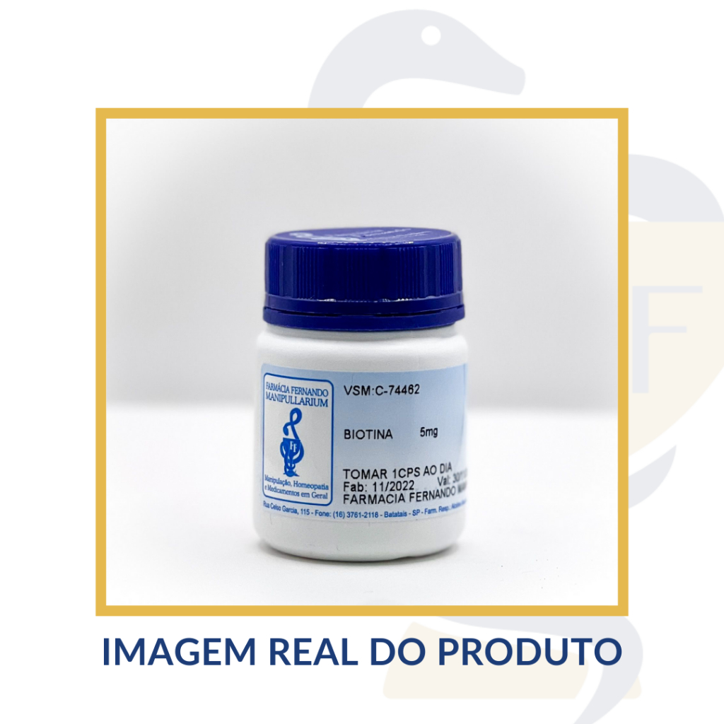 Seja bem-vindo à Farmácia Fernando Manipullarium! Desde 1894, trabalhamos exclusivamente com fornecedores certificados, sempre oferecendo produtos de alta qualidade. É um prazer atendê-lo! ______________________________________ Nosso suplemento de Biotina 5mg é formulado para apoiar a saúde da pele, cabelos e unhas. A Biotina, uma vitamina essencial do Complexo B, é conhecida por seu papel no metabolismo de nutrientes e na manutenção de tecidos saudáveis. Este suplemento é Ideal para quem busca uma dose conveniente de Biotina, para incorporar em sua rotina diária de cuidados pessoais. Você recebe nesta compra: Biotina 5mg, 2 potes com 60 doses (60 cápsulas) cada. ✅ FÓRMULA MANIPULADA ✅ QUALIDADE GARANTIDA ✅ COM NOTA FISCAL ✅ ENVIO EM 24 HORAS Ficou com dúvida? Chame a gente via chat, será um prazer te atender! ______________________________________ - COMPOSIÇÃO POR DOSE (1 CÁPSULA): Biotina 5mg Excipiente qsp. (SEM GLÚTEN - SEM LACTOSE) ______________________________________ - SUGESTÃO DE USO: Tomar 1 dose (1 cápsula) uma vez ao dia, após refeição. ______________________________________ - VALIDADE: 12 MESES, A PARTIR DA DATA DE FABRICAÇÃO. Fique tranquilo, você receberá em sua casa uma produção recente! ______________________________________ - CONSERVAÇÃO: Após aberto, manter a embalagem bem fechada e armazenar em local fresco, seco (15° a 25°) e ao abrigo de luz. Produto lacrado para sua proteção. Não utilizar em caso de violação. Manter fora do alcance de crianças. ______________________________________ - ADVERTÊNCIAS: Gestantes, idosos, crianças, lactantes e pessoas que apresentam doenças ou alterações fisiológicas, somente devem consumir este produto sob orientação. ______________________________________ - REFERÊNCIAS: Literaturas de fornecedores. ______________________________________ ''ISENTO conforme resolução RDC 27 de 06 de agosto de 2010 anexo I.'' Este produto não deve ser utilizado por menores de 18 anos sem orientação. Imagens meramente ilustrativas. Os resultados e indicações referentes ao uso desse produto foram avaliados e comprovados pelo fabricante deste insumo farmacêutico. Não garantimos os resultados descritos, estes variam de pessoa para pessoa dependendo de diversos fatores como alimentação, prática de exercícios físicos, presença de outras patologias, bem como, o uso correto do produto conforme descrito na posologia.”