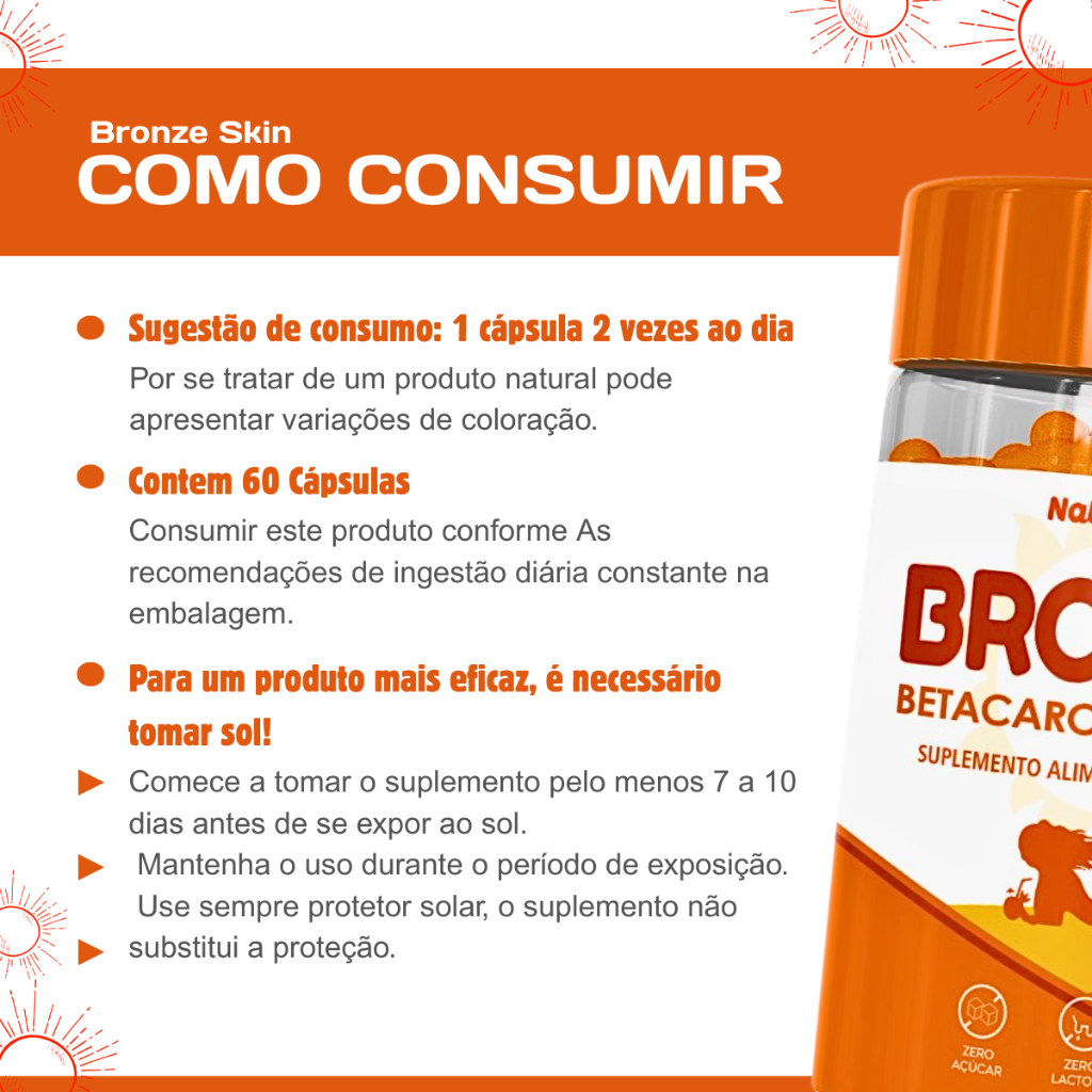 DESCRIÇÃO DO SUPLEMENTO ALIMENTAR: KIT 2 POTES DE POTE BRONZE BETACAROTENO SKIN COM 60 CÁPSULAS CADA POTE DE 500MG = 120 CÁPSULAS ATENÇÃO: PRODUTO NATURAL. COMPOSIÇÃO NUTRICIONAL: PORÇÃO DE 1G (2 CÁPSULAS) BETACAROTENO 20 MG INGREDIENTES: BETACAROTENO. 0% AÇUCAR 0% LACTOSE 0% GLÚTEN SUGESTÃO DE USO: TOMAR 1 CÁPSULA 2 VEZES AO DIA POR SE TRATAR DE UM PRODUTO NATURAL, PODERÁ APRESENTAR VARIAÇÕES NA COLORAÇÃO. FABRICADO POR : NATUNÉCTAR PRODUTO DISPENSADO DE REGISTRO CONFORME RDC 240/2018 PRODUTO INDICADO PARA GRUPO POPULACIONAL : 19 ANOS MANTER FORA DO ALCANCE DE CRIANÇAS. NÃO EXCEDER A RECOMENDAÇÃO DIARIA ATENÇÃO : ESTE PRODUTO NÃO DEVE SER CONSUMIDO POR GESTANTES ,LACTANTES E CRIANÇAS EXCETO SOB SUPERVISÃO MÉDICA.